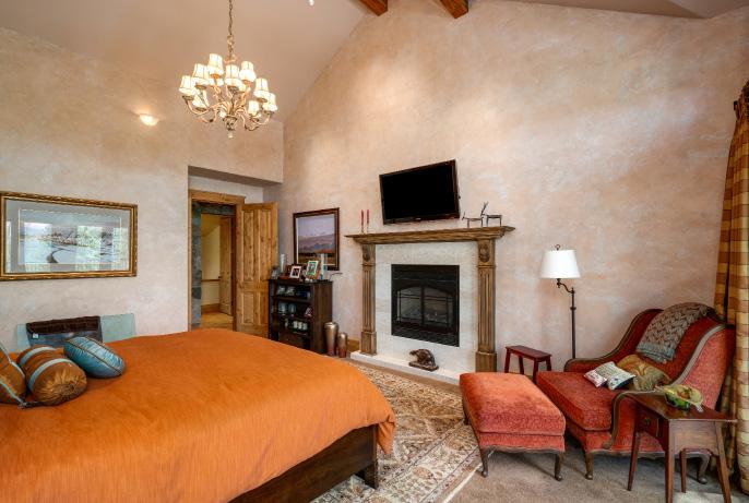 The grand spaces of the great room, formal dining room, chef’s kitchen, and outdoor living room are oriented to capture the views of the South Valley. Vaulted ceilings, hand-hewn beams, and custom iron and woodwork are just a few of the details found throughout the home.