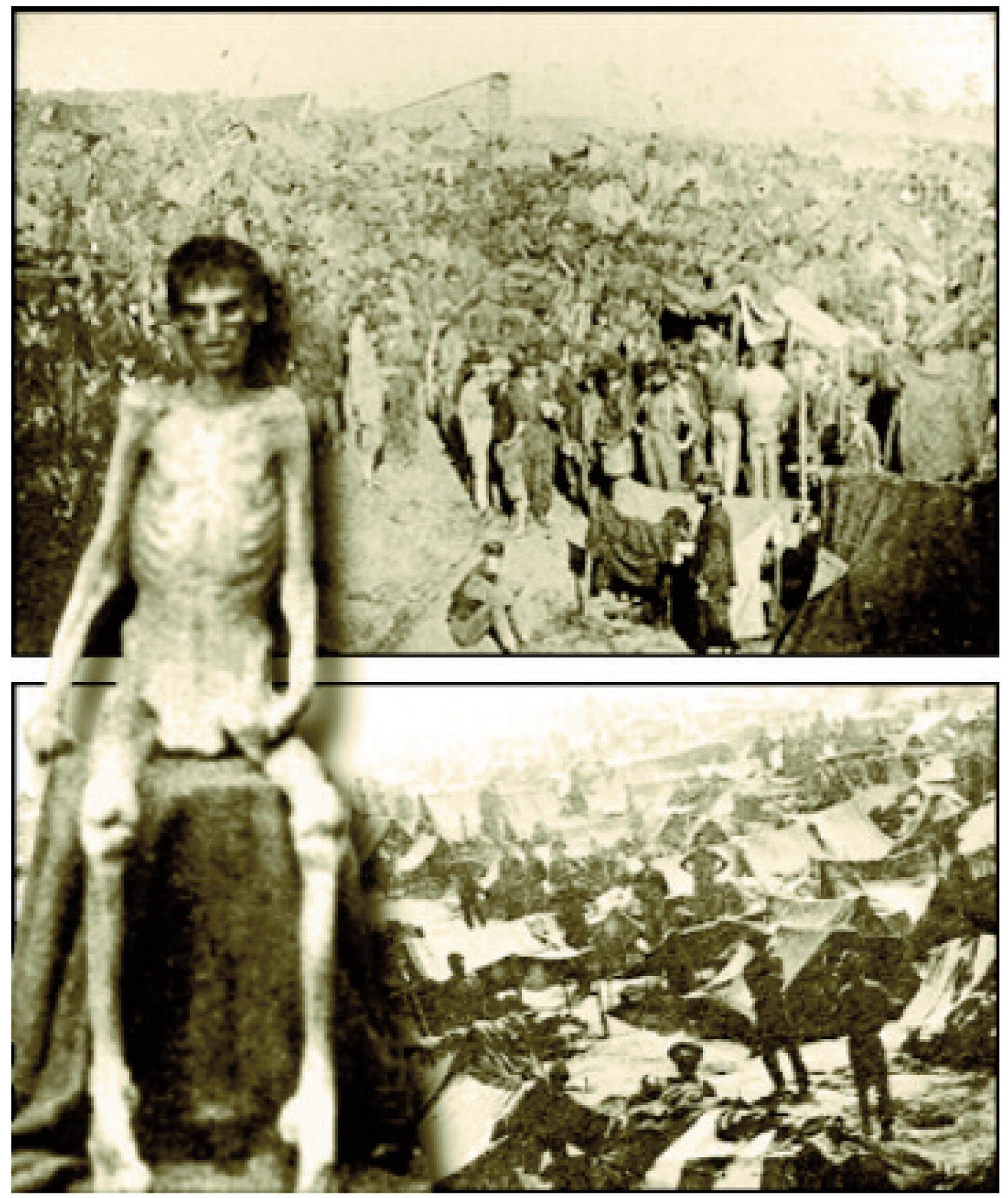 from the burning rays of a tropical sun by day. One could, and did, witness every stage of mental and physical disease, as starving, emaciated, prisoners would wither away, festering with unhealed wounds; gnawed by the ravages of scurvy and gangrene; with swollen limbs and distorted faces, covered with vermin which they had no power to kill, exposed to the flooding rains which drove them drowning from the miserable holes in which, like pigs, they burrowed. The prisoners would lie in squalor, with naked limbs and matted hair. They were filthy with smoke and mud; soiled with the very excrement from which their weakness would not permit them to escape. They were eaten by the gnawing worms which their own wounds had attracted; with no bed but the earth; no covering but the sky; these men endured what has been described by many as a combination of the worst of Dante’s Inferno and Milton’s Hell.