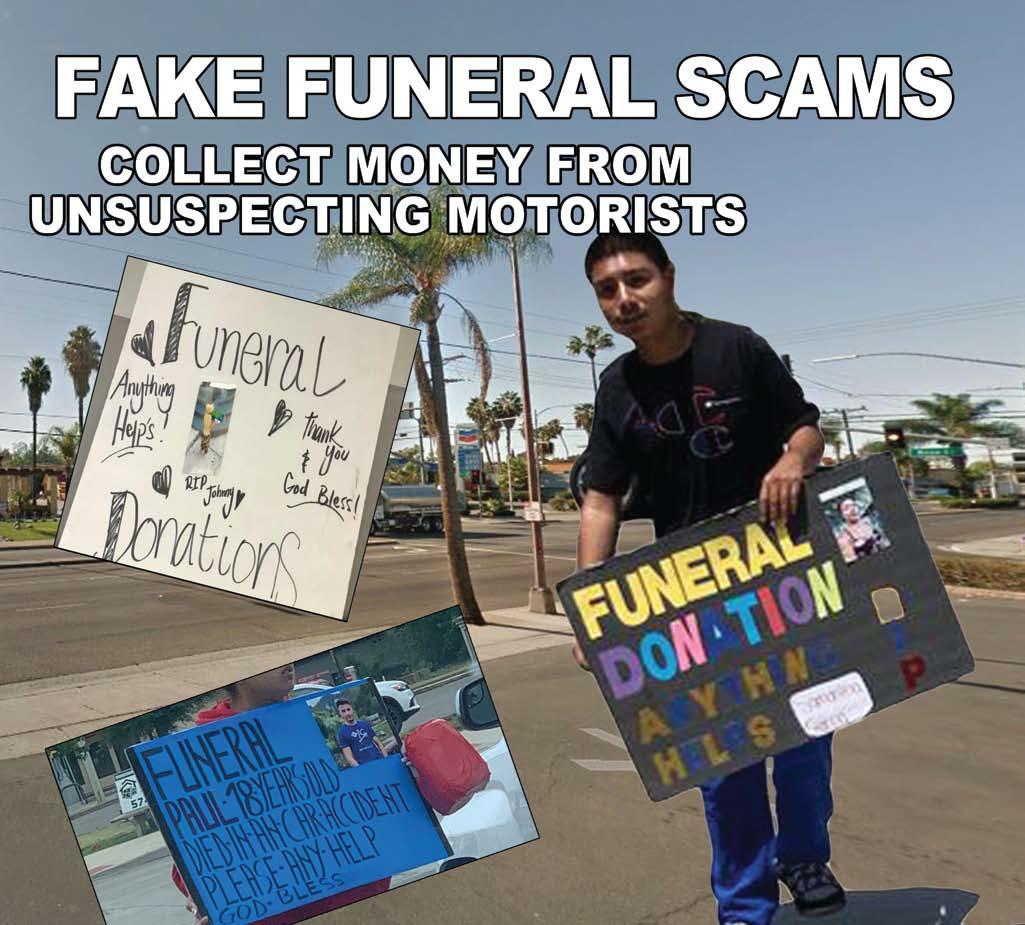 In this disturbing scenario, the scammers, who were exposed by police, were walking through traffic at intersections showing motorists large signs with FUNERAL written on the top along with a photo of a young teenager who allegedly died a tragic death.