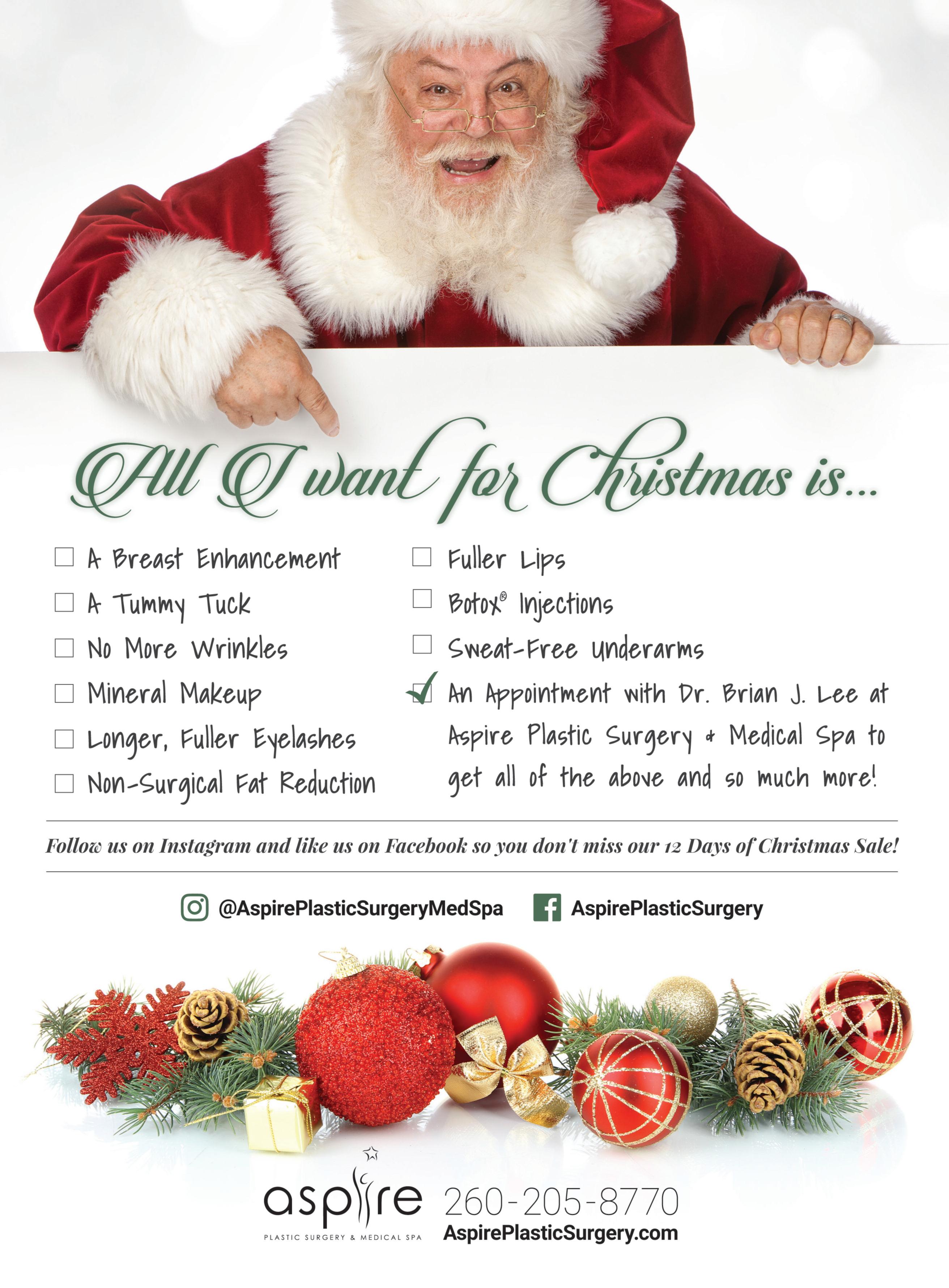 Aspire Plastic Surgery and Medical Spa will have 12 exclusive product and treatment specials in honor of the holidays RSVP required 8:30 a m -4:30 p m Monday through Friday, 7735 W Jefferson Blvd , Fort Wayne 260 427 7473, aspireplasticsurgery com