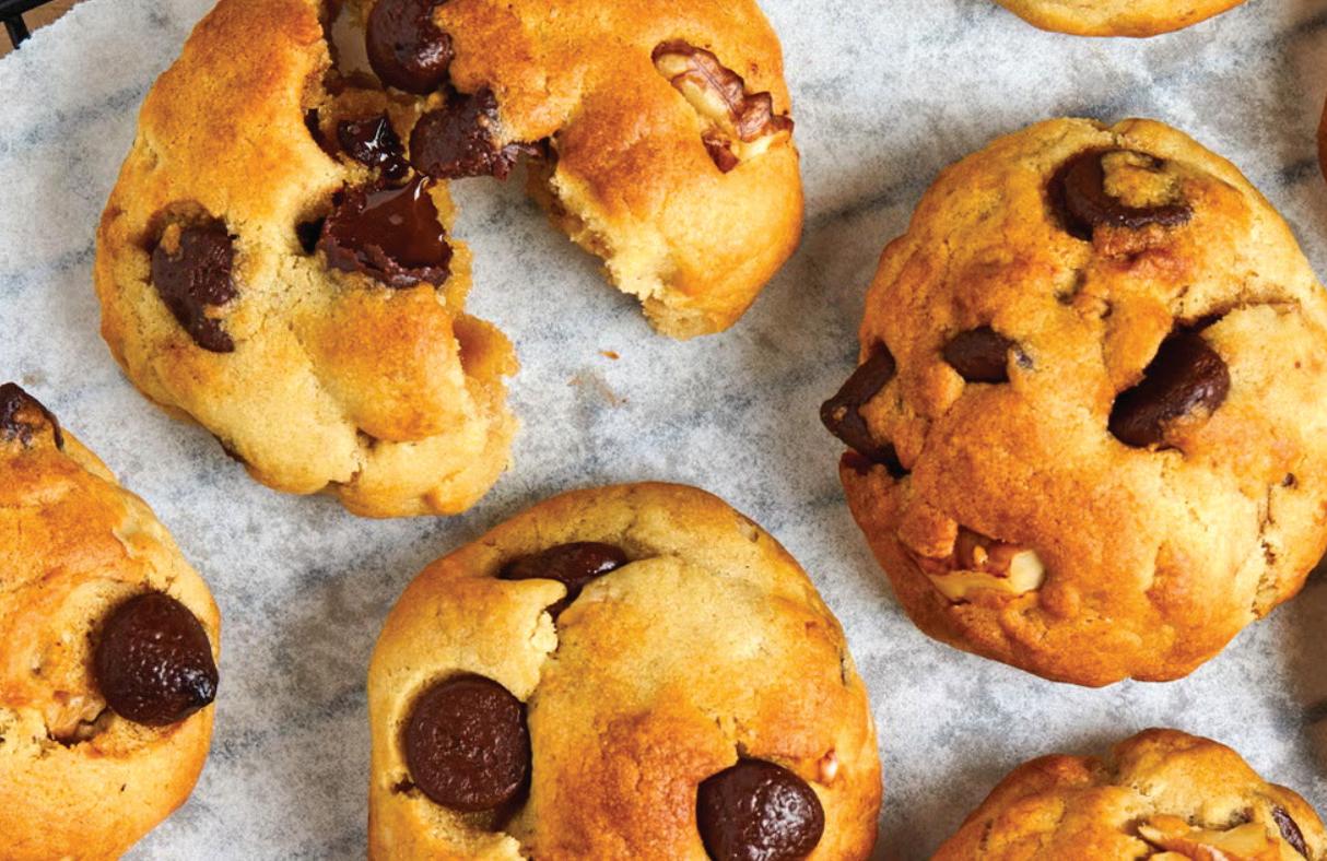 2. Place a small piece of parchment in the basket of an air fryer, making sure there is still room around the edges to allow air flow. Working in batches, use a large cookie scoop, about 3 tablespoons, and scoop dough onto parchment, leaving 2” between each cookie, press to flatten slightly.