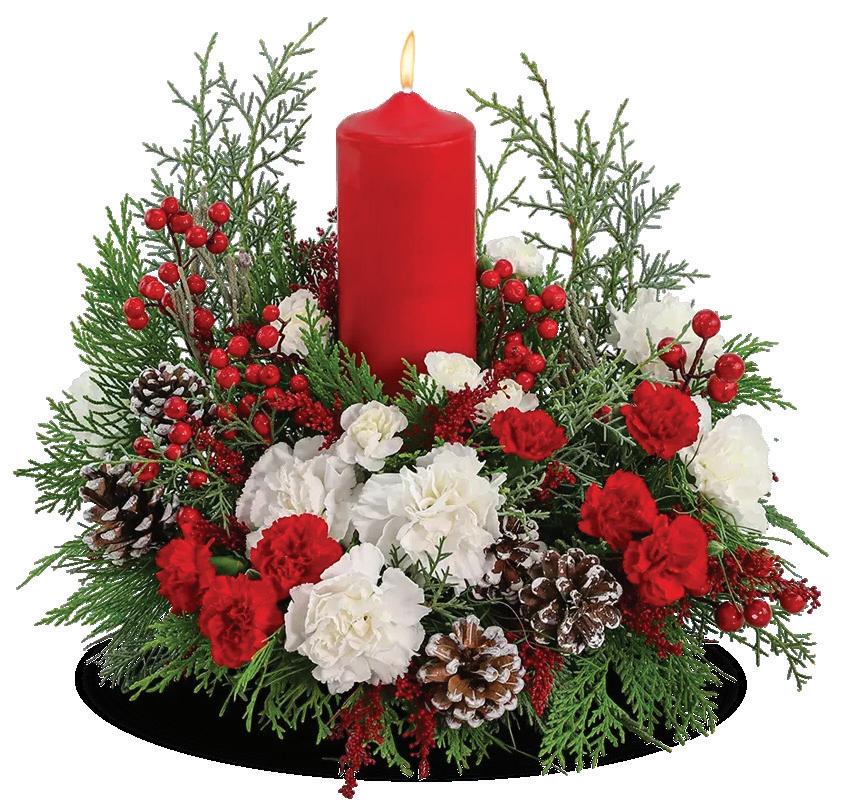 Bring timeless beauty to your table with this fresh holiday centerpiece of evergreens, pine cones, red berries, carnations, and white mums — topped with a glowing red pillar candle. A perfect way to make your home merry and bright.