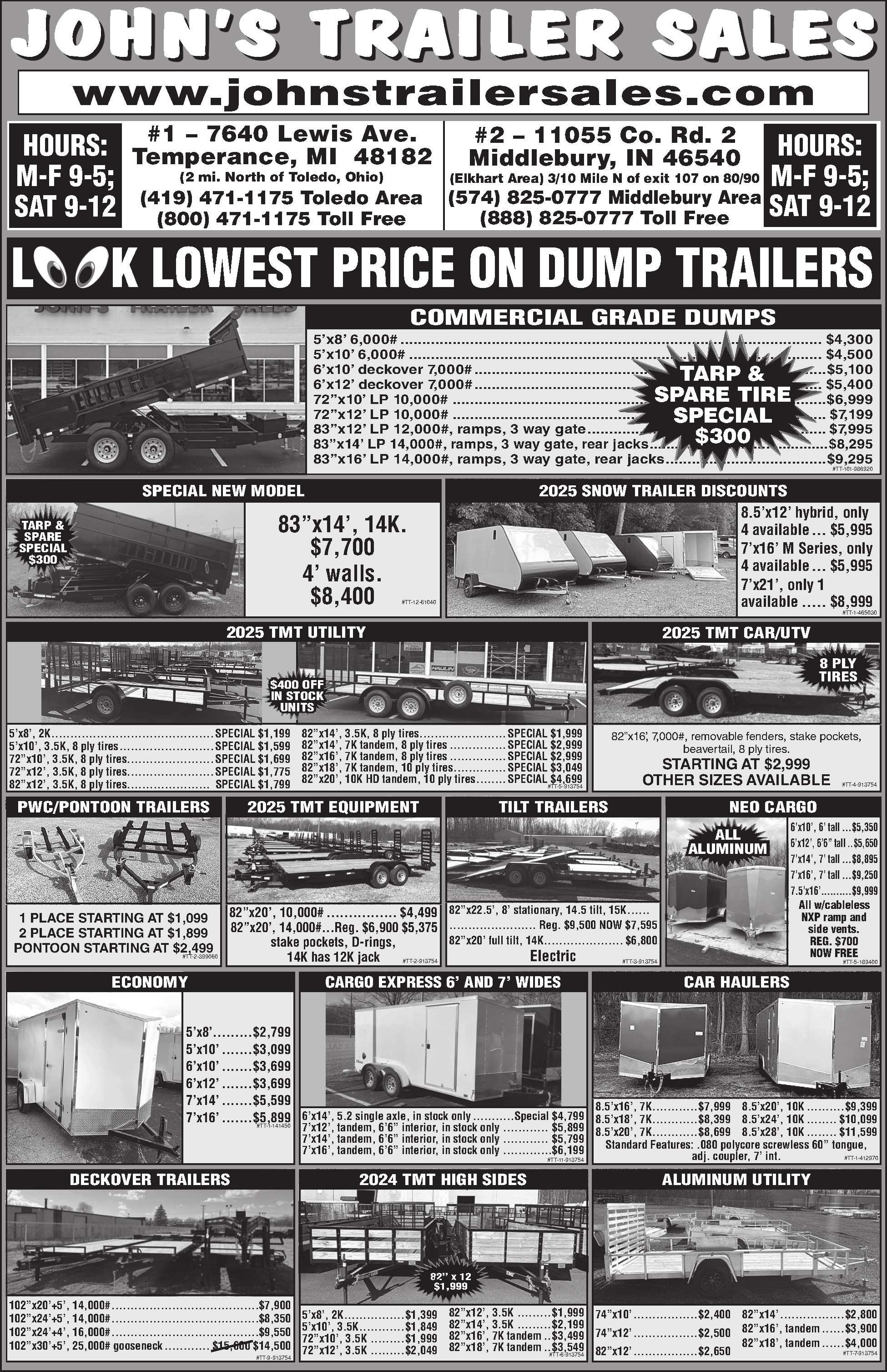 25’+5’, Monster ramps, 2 jacks, lockable toolbox, low profile, tandem duals, new spare tire and rim. 2 in stock.