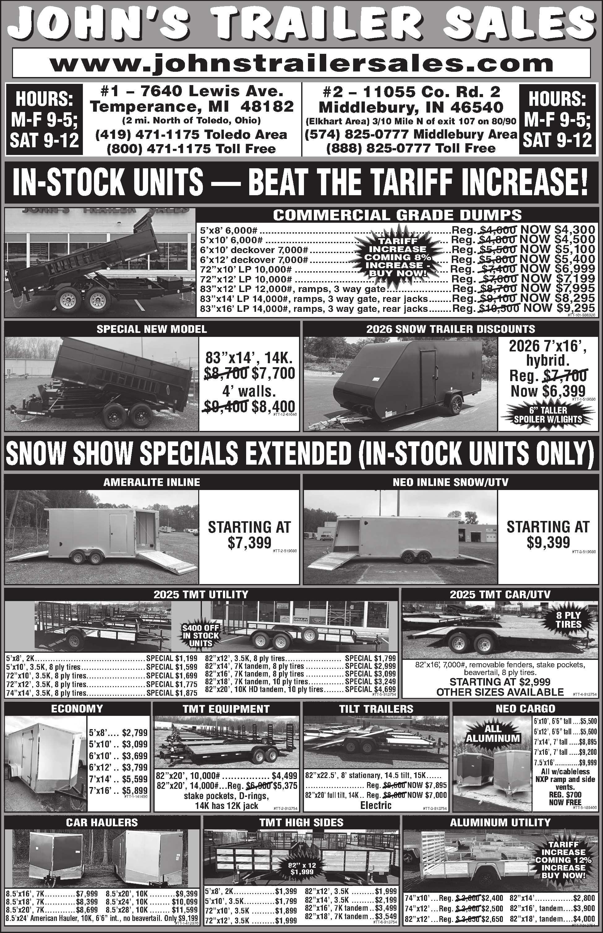 2026CORNPROLOWPRODUMP. 81”x14’,scissor hoist,2-7000#torsionaxles,slide-outramps,double reardrs.,3/16”floor.$13,200.Othersizesandbrands onourlot.ZahmTrailerSales,Huntington,IN. zahmtrailersales.comM-F9-5 260-356-8322