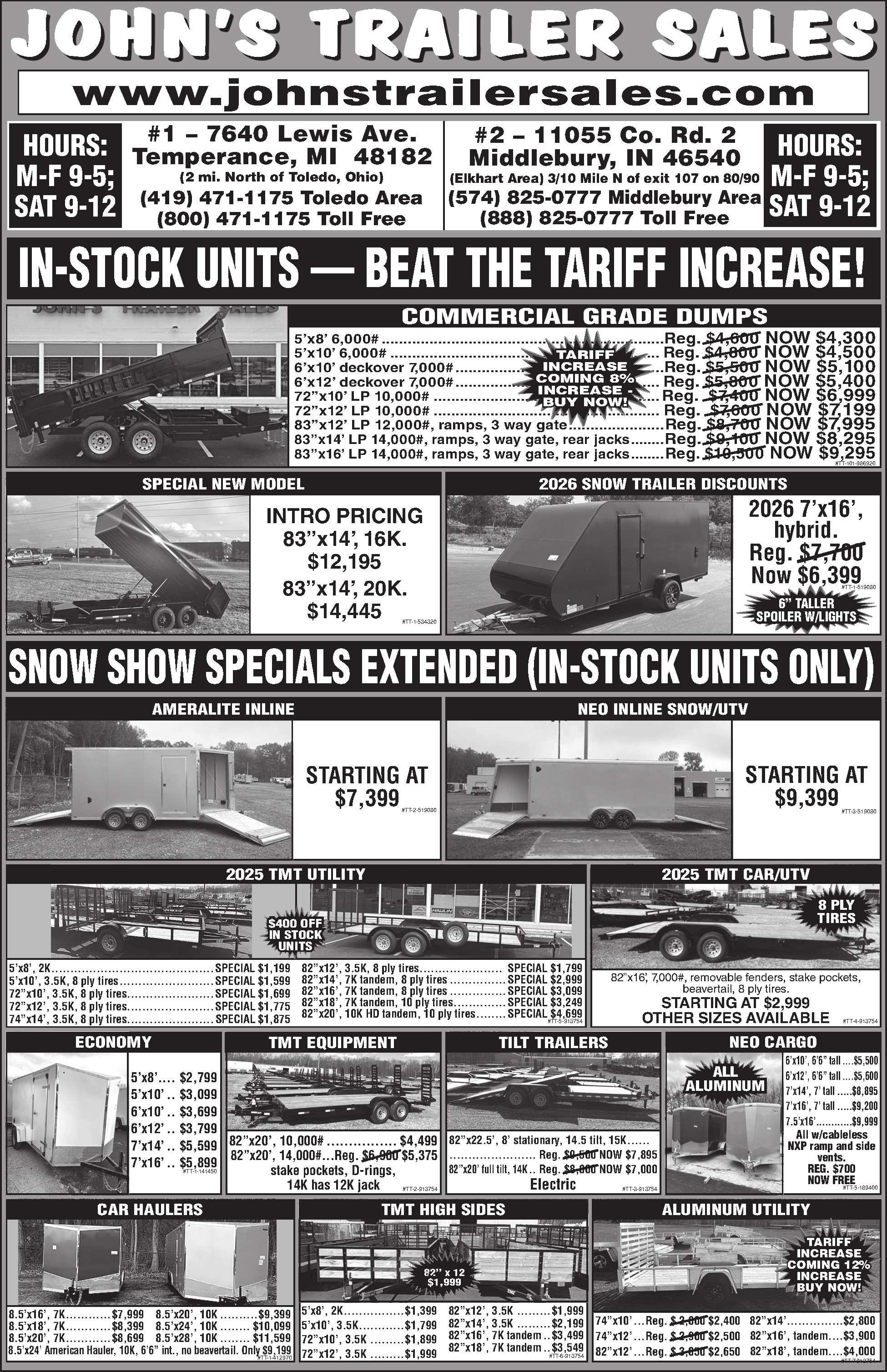 2026CORNPROTILT. 78”x12’+2’tail,7,000#torsion axlew/brake,16”10ply,8lugradials.$5,800.Several largermodelsinstock.ZahmTrailerSales,Huntington, IN.zahmtrailersales.comM-F9-5 260-356-8322