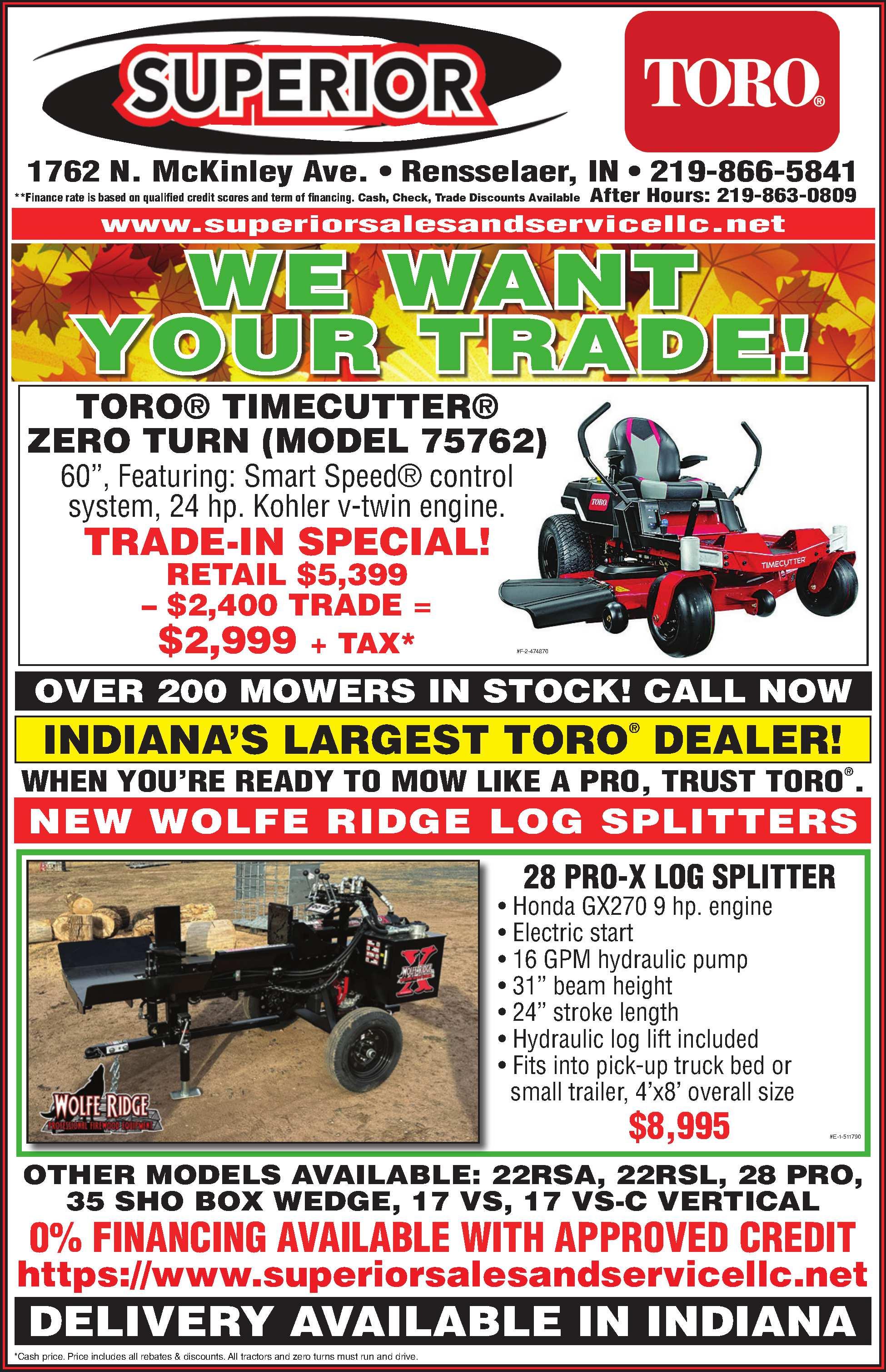 TOROTIMECUTTER (75762)ZEROTURN MOWER. 60”featuringSmartSpeed Control System,24hp.KohlerV-Twin.TradeInSpecial, Retail$5,399-$2,400TradeAllowance=$2,999 +tax.(Tradesmustrunanddrive).Takecharge ofyouryardwithToro.SuperiorSales& Service,Rensselaer,IN.219-866-5841 511820