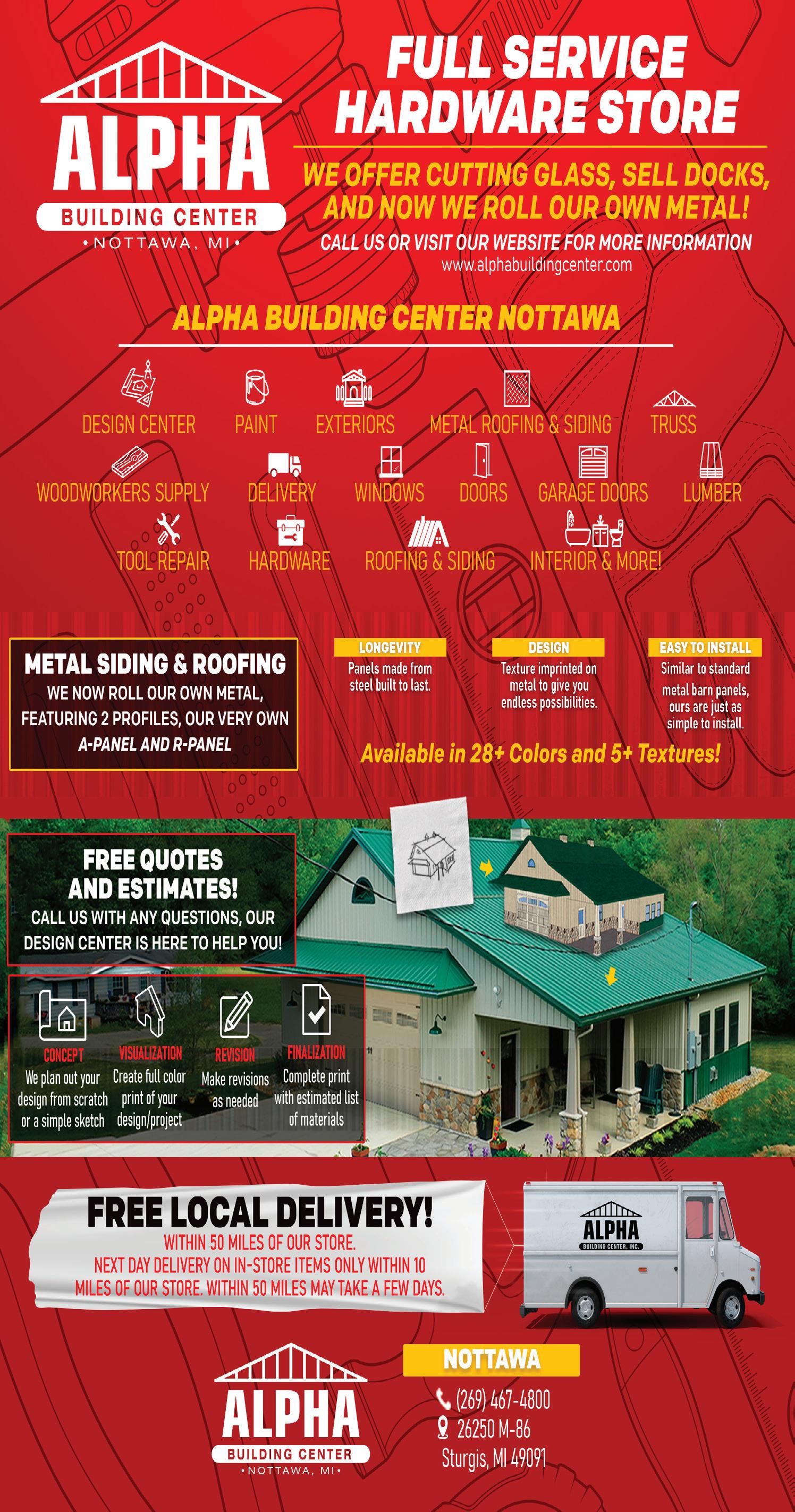 | Klinger Lake Directory 2024| 53 Woodworking Rock Run Cabinetry High Quality Aluminum Cabinets • Kitchen • Mudrooms • Garages 11 Colors • Custom Built Kitchens & Baths • Furniture Custom Countertops • Quartz • Granite • Corian • Cultured Marble for Baths Mini Barns • Poly Furniture workDependable you can trust! J &D’s Mon-Fri 9am-5pm • Sat 10am-2pm 27951 Wasepi Rd. • Centreville, MI • 269-432-2788