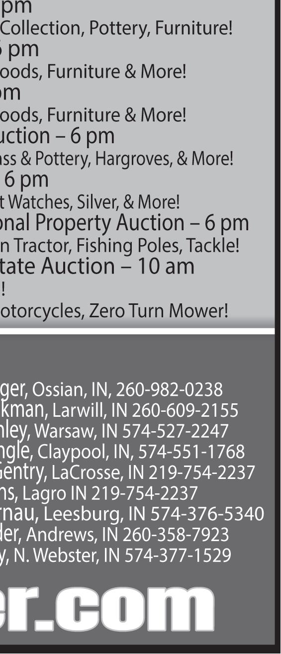 6 p.m. Wednesday, May 3, at 1146 S. 1450E, Akron. 2½ acres on Rock Lake. Home features open kitchen/living area with vaulted ceilings, large walkin closet, guest home. bidmetzger.com, (260) 982-0238.