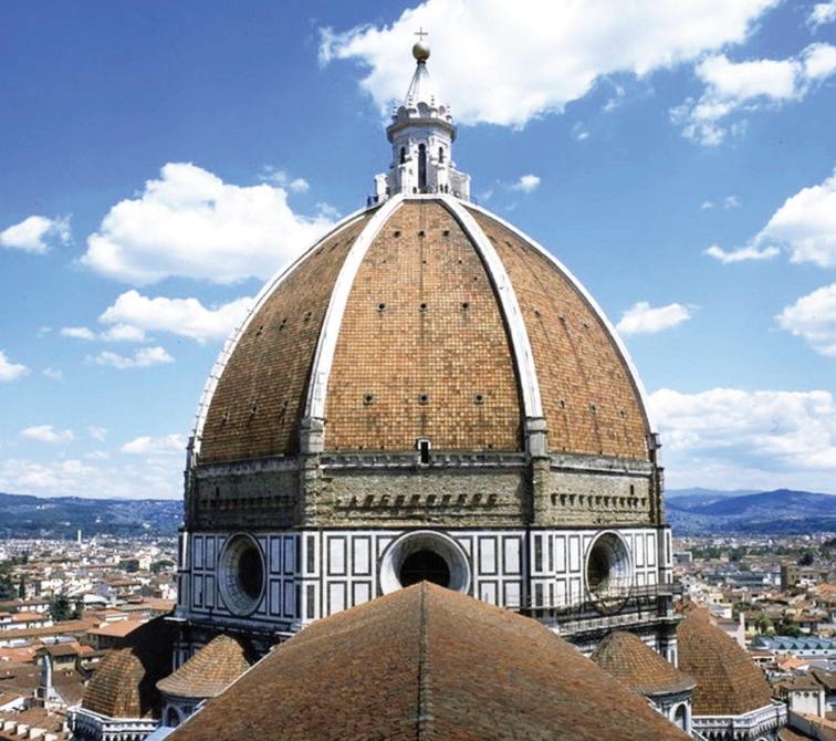 In fact, the dome consists of one internal dome more than 2 meters thick, “consisting of large arches held together by ribs and made of bricks arranged in a herringbone pattern; and an external covering, covered with terra cotta tiles and marked by eight ribs of white marble.” (duomo.firenze.it)