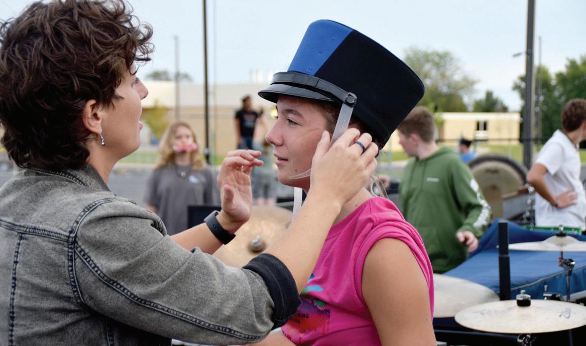 GETTING A LITTLE HELP Fairfield Band member Vienna Griffith gets some assistance from Band Director Mykayla Roskos-Neilson with her uniform hat.