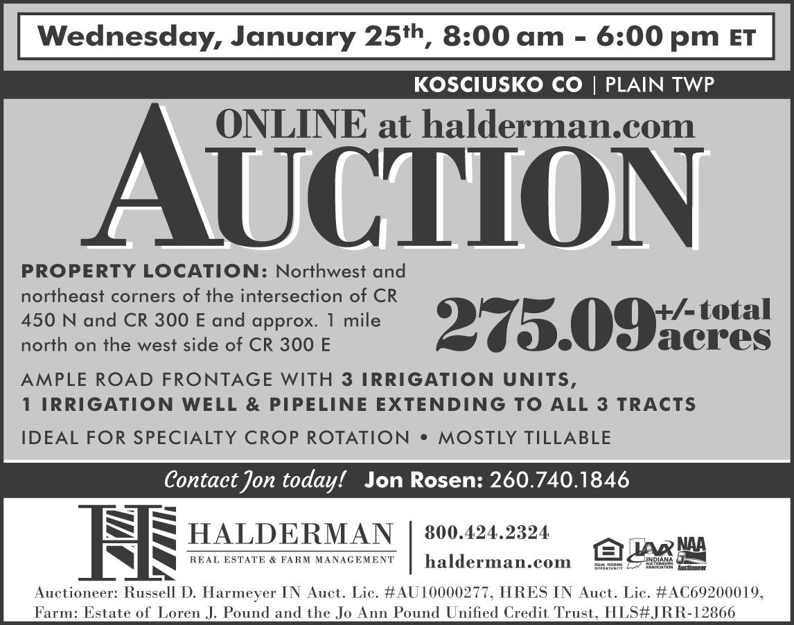 8 a.m. to 6 p.m. Wednesday, Jan. 25. Online at halderman.com. 275.09 acres located at northwest and northeast corners of the intersection of CR 450N and CR 300E, approximately 1 mile north on the west side of CR 300E. Ample road frontage with three irrigation units, one irrigation well and pipeline extending to all three tracts. Contact Jon Rosen, (260) 740-1846.