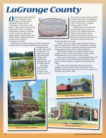 LaGrange County O ld-fashioned rural character lives in harmony with progress and growth in LaGrange County. In fact, “LaGrange” is French for “The Farm,” a place where old and new ideas tend to meet. Located in northeastern Indiana, LaGrange County is home to the third largest Amish community in the United States. Approximately 43 percent of the county’s population is Amish. Residents and visitors enjoy the idyllic farmland, 67 lakes and tree-shaded neighborhoods scattered throughout the county. The county is made up of 11 small towns and unincorporated villages with populations ranging from 525 to 3,000 citizens. LaGrange, located in the heart of the county, is the county seat. It is How Reserve between Mongo and