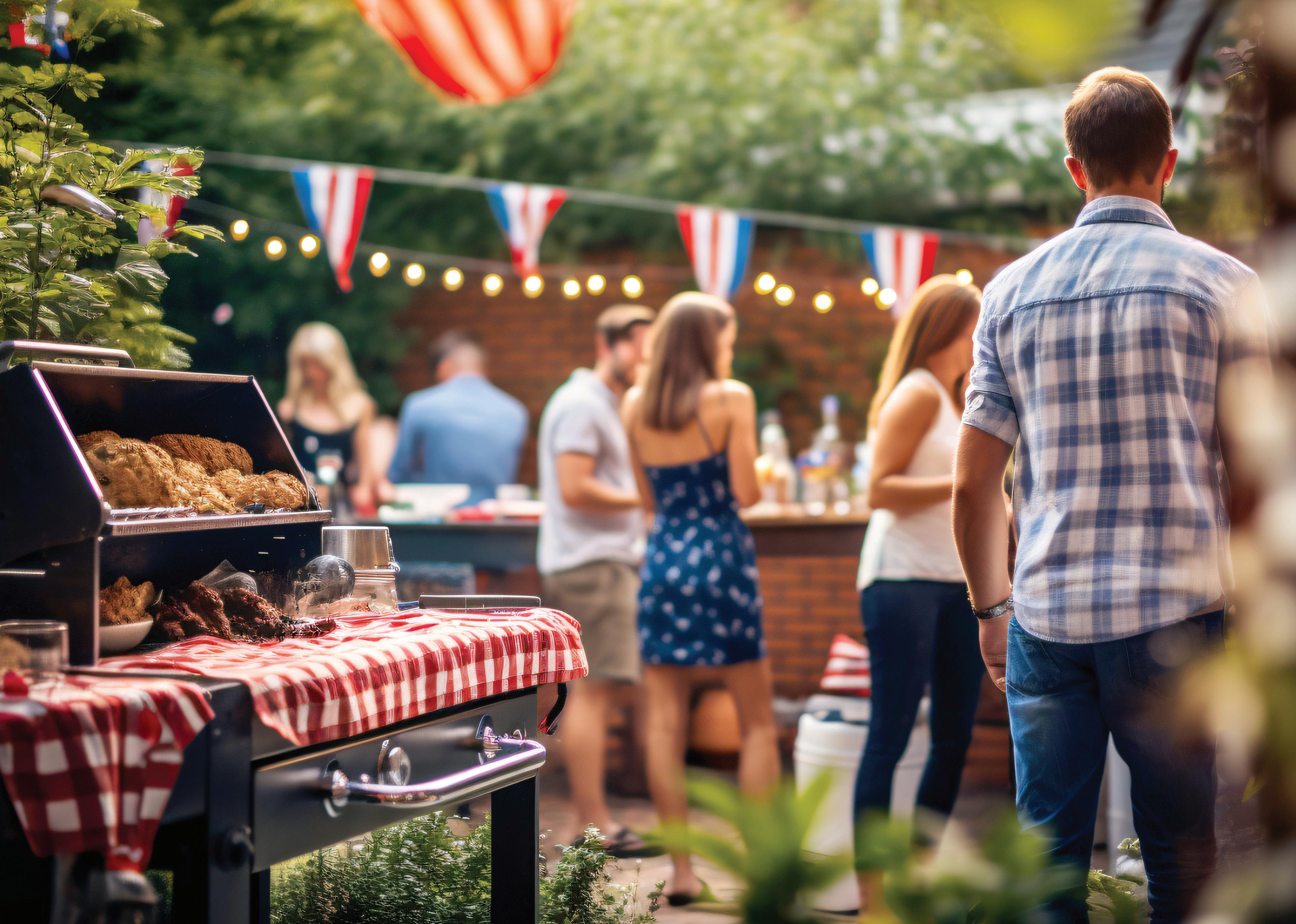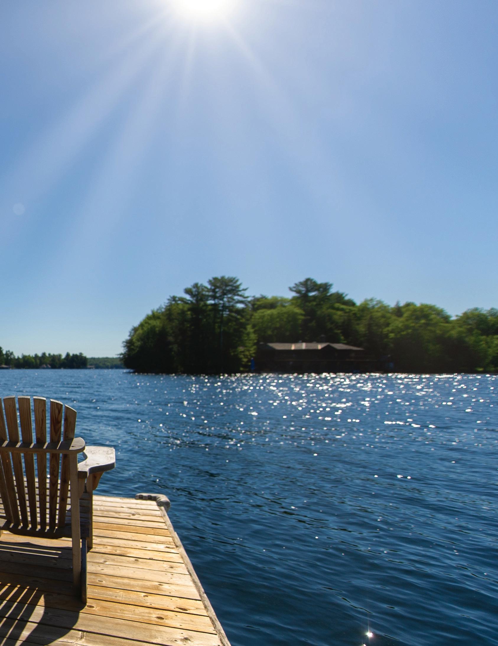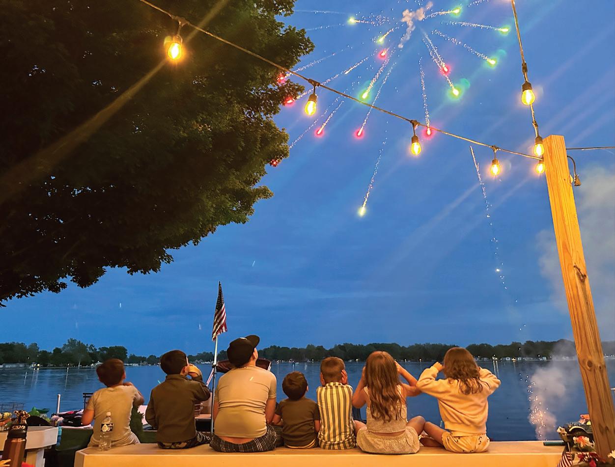 American flags wave from shore to shore, where families gather to celebrate under the summer sun. Streamers and buntings adorn the docks and boats, and decks and pergolas, adding splashes of red, white, and blue to the warm and welcoming surroundings. Guests of multiple generations share wide smiles and fond embraces amidst their own chorus of laughter and cheers.