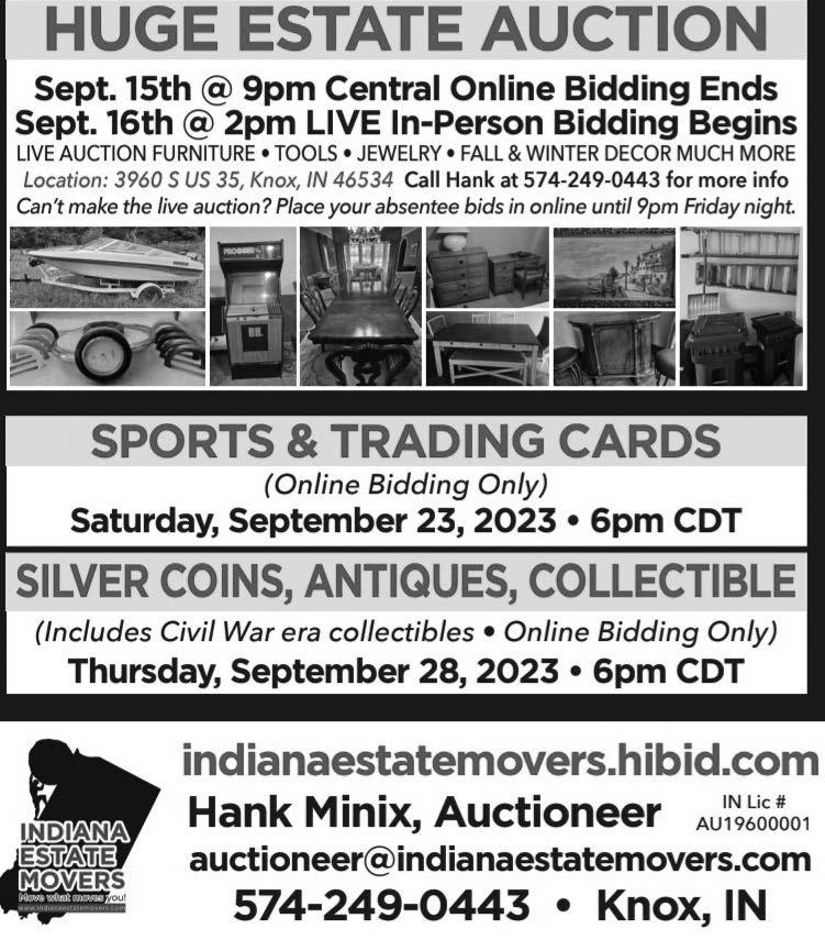 BIG BARN Sale: Fri. & Sat., Sept. 15 & 16 @ 4324 N 1050 W, Medaryville, 1.5 miles north of Shadyhill Speedway. Lots of tools, collectibles, furniture & everything. . . . . . .37-4
