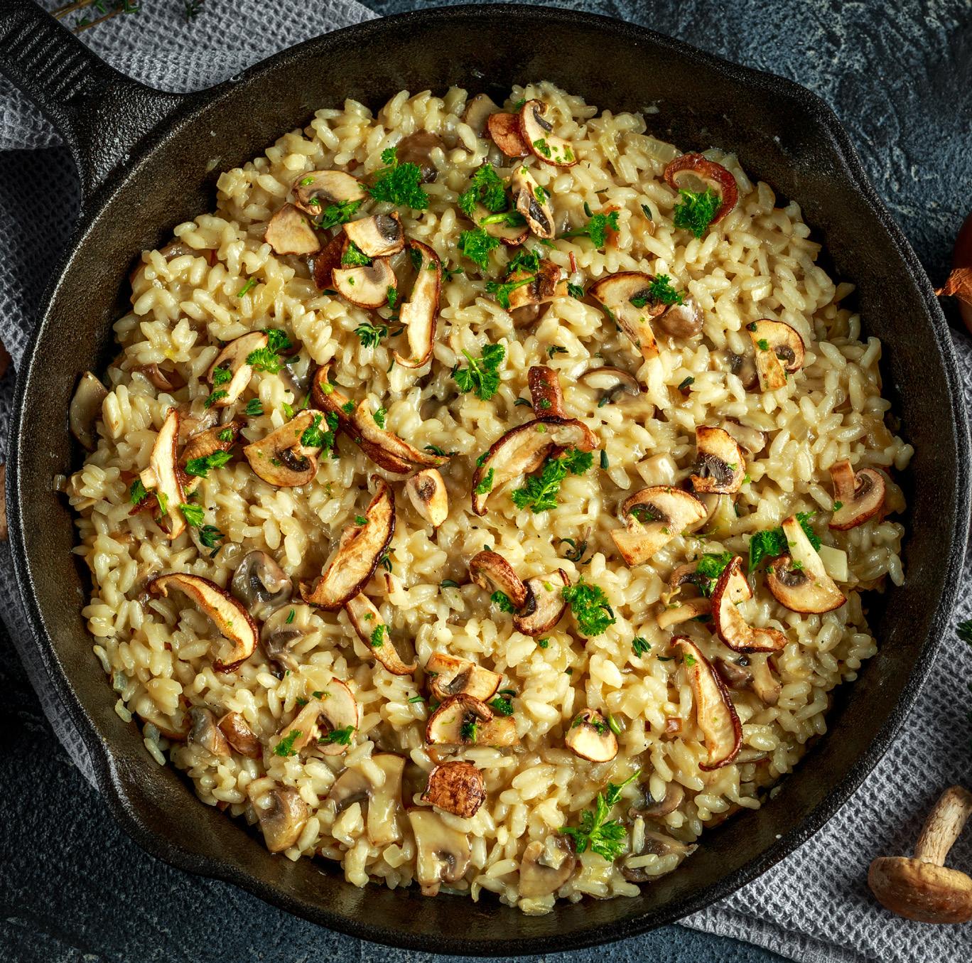 Set the pine nuts on a sheet pan and cook until lightly toasted, about 8 minutes, set aside Increase the oven temperature to 425. Place the mushrooms gill side down on a sheet pan, drizzle with olive oil and season with a pinch of salt and a twist of black pepper. Roast them until browned and softened, about 12 minutes Meanwhile, in a medium bowl, combine the wild mushroom risotto, egg, parsley and toasted pine nuts and stir to combine.
