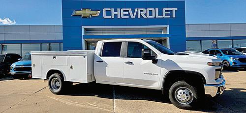 Single cab w/Knapheide steel dump box, fold-down sides, elect. over hyd., Duramax diesel, 4WD, automatic trans., 54,000 mi., runs/drives well, clean body, salvage title due to previous bed dmg. that has been repaired, ready to work.