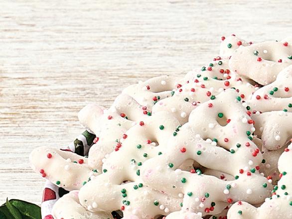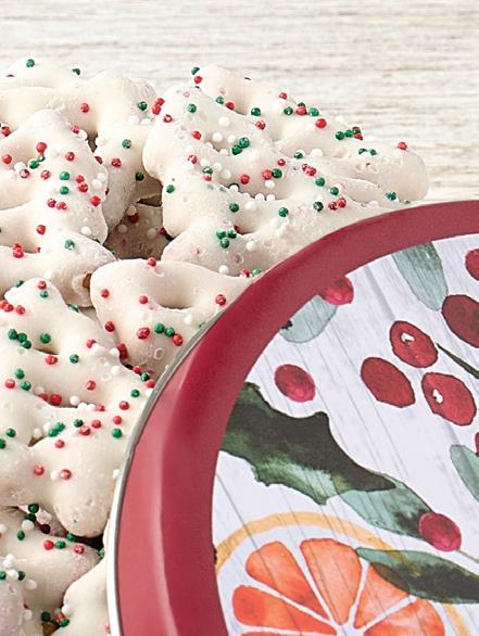 Crisp, golden pretzels shaped like cheerful Christmas trees are dipped in smooth, creamy white confectioner’s coating, then sprinkled with merry red and green accents for a treat as beautiful as it is delicious. Presented in our exclusive Pittman & Davis holiday tin, these festive sweets are perfect for sharing, gifting, or brightening up your holiday table.