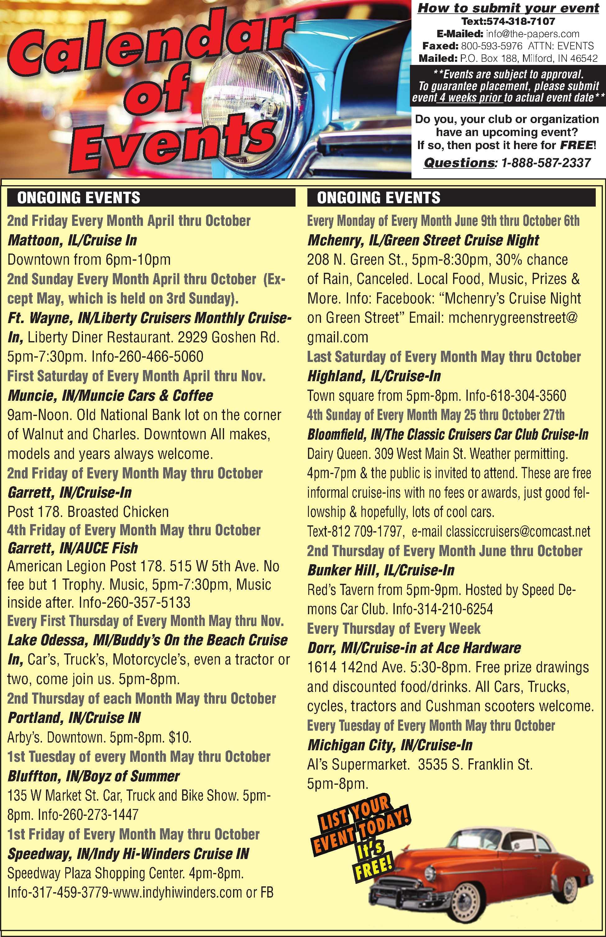 WEAREAFULLLINERESTORATION PARTSSTOREFOREARLYCAMARO, CHEVELLE&NOVAS. Sheetmetal,bumpers, moldings,carpet,interiors,rubberseals&much, muchmore.Alwayslookingtobuyprojectcarsor partscars.Stopbyourstore,open6daysaweek: M-F9a.m.-6p.m.&Sat.9a.m.-1p.m.Locatedone halfmileEastofLucasOilRacewayPark. Freeman’sMusclecarMotorsports,10747E.US Hwy.136,Suite101,Indianapolis,IN46234. email:clarencefreeman@att.net 317-328-8360