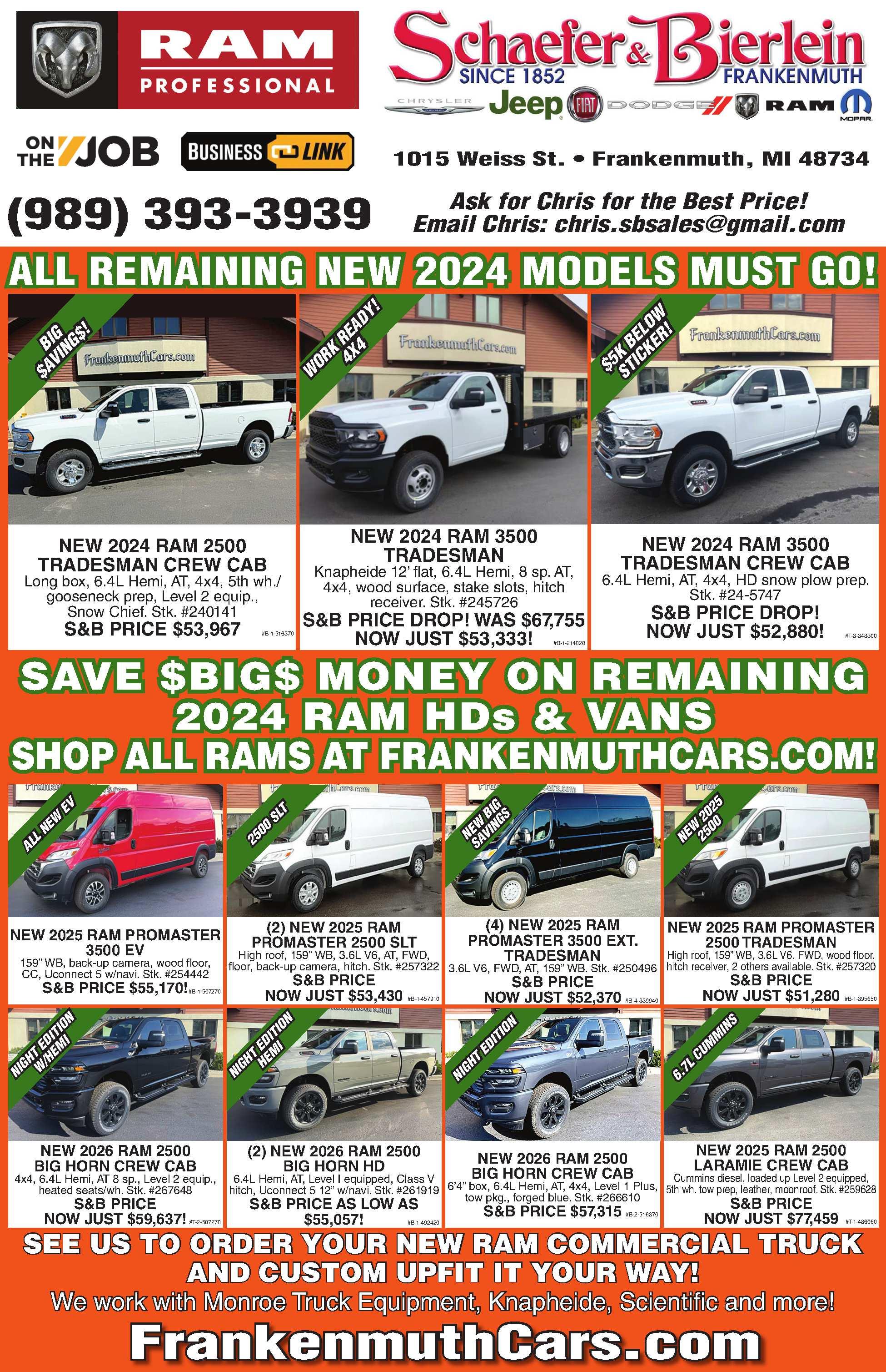 2019RAM2500MEGACABLARAMIE. 6.4LHemi,BlackPackage,4WD, moonroof,12”radio,topper,bedslide, leather,1-owner.S&BPrice$43,995. SchaeferBierlein,Frankenmuth,MI. 989-652-9965