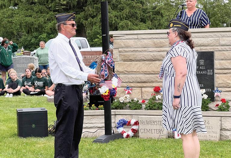 Following the brief parade, many people gathered at Webster Cemetery for a presentation by the American Legion. Commander Cat Bowers led the gathering in the Pledge of Allegiance before the WMS band played its rendition of the national anthem. After a prayer by the Legion’s chaplain, a wreath was presented and laid by Adjutant Kim Pulsipher and Sergeant-at-Arms Terry Snyder. Pulsipher also read the names of veterans from North Webster who gave their lives in service to their country.