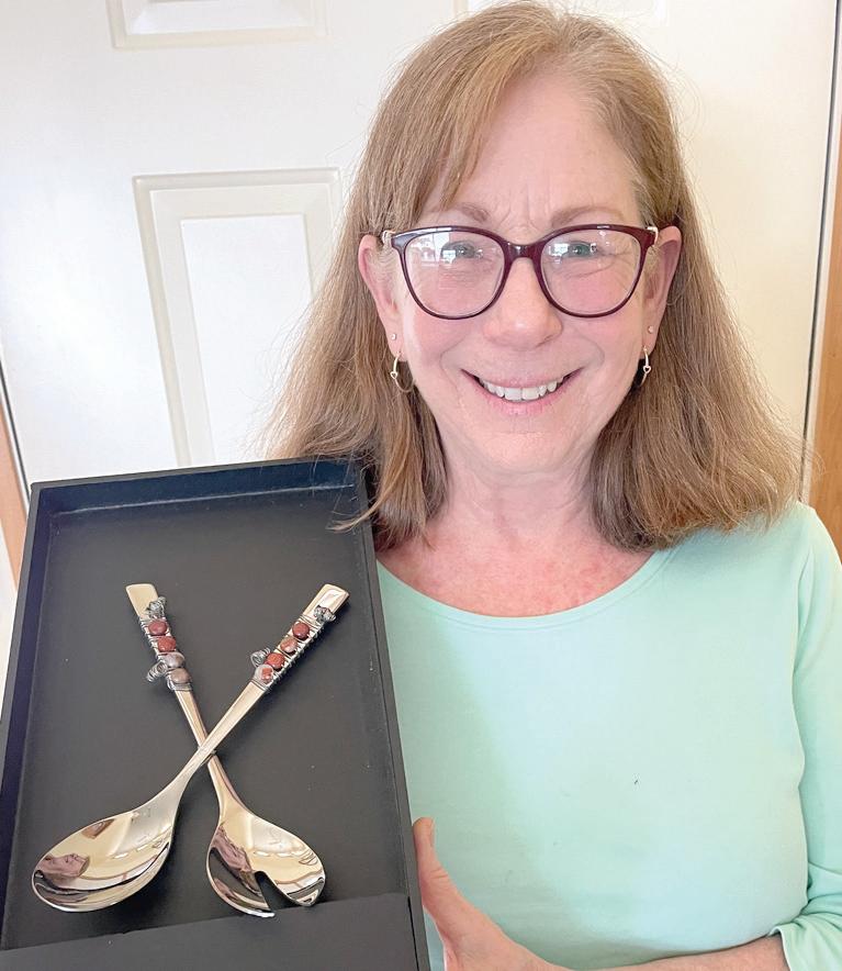 length of stainless steel wire with a gauge typically of 20 and 22, I wrap the stones securely onto the utensils. I do not use glue to attach the beads,” said Kuhn. Among the utensils she sells are long-handled iced tea spoons, pickle forks, buffet sets, olive spoons, cheeseball spreaders, serving spoons and forks, coffee scoops and salad sets.