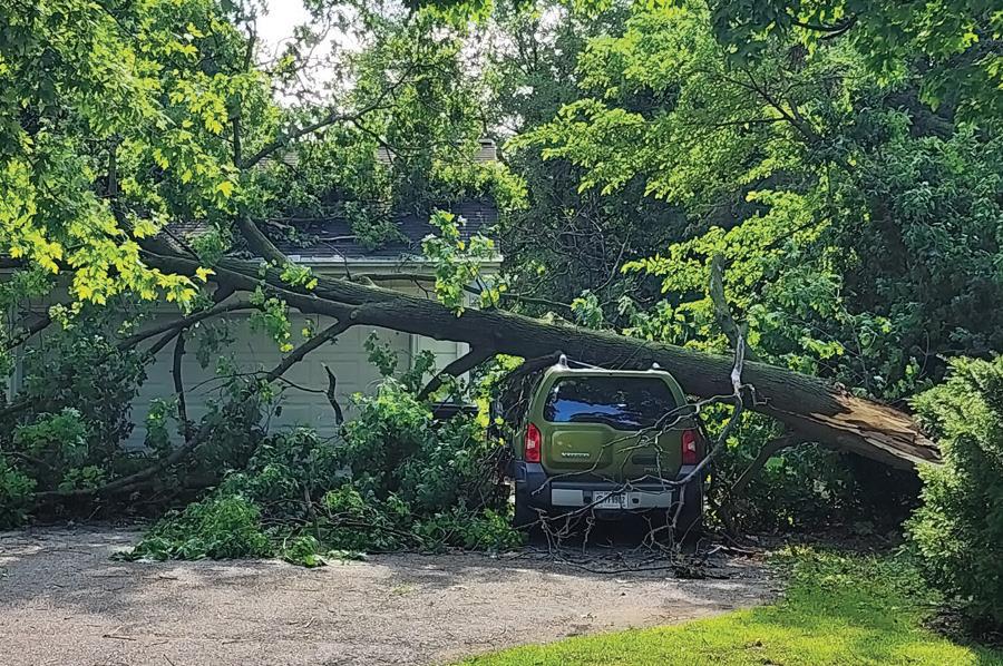 falling across the roadway or sidewalk. Large tree limbs blocked the street at Jorge and Maria Castro’s residence, 205 N. Main St. Corey and Krystal Veach, at the corner of Henry and Syracuse streets, MIlford, had a large tree limb not only fall on their home causing some roof damage, but also on top a vehicle parked in their driveway.
