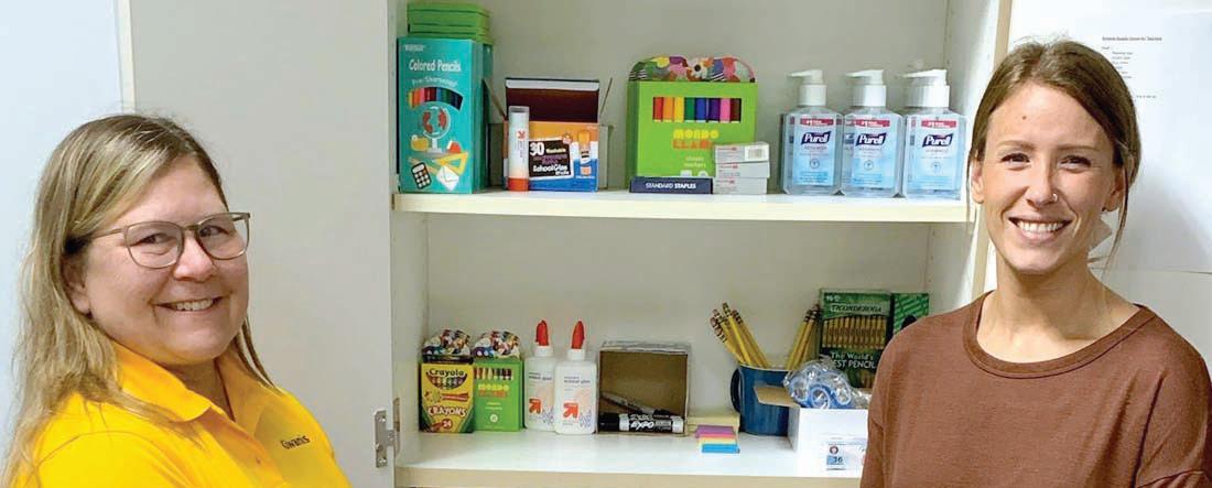 LAKELAND KIWANIS Club of North Webster recently added supplies to a teacher supply closet they maintain at the North Webster Elementary School. Teachers are able to take needed items from the closet to use in their classroom. Pictured above in front of the closet are Janet Anthony of Lakeland Kiwanis, left, and NWES kindergarten teacher Emily Buttermore.