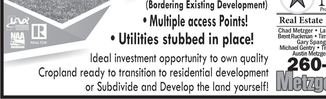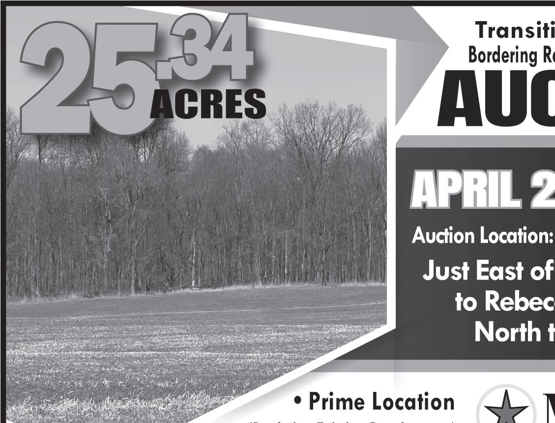 6:30 p.m. Thursday, April 27, at Claypool Lions Club. Property located just east of SR 15 to Rebecca Street and then north. Transitional cropland bordering residential development, 25.34 acres with multiple access points and utilities stubbed in place. metzgerauction.com, (260) 982-0238.