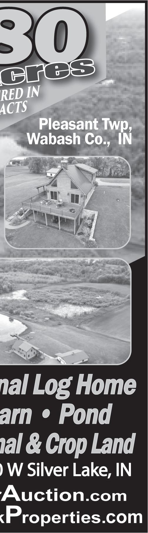 6 p.m. Tuesday, May 2, at 815 Rural St., Akron. Property located at 14850 N. 700W, Silver Lake. 80 acres offered in five tracts with log home, pole barn, pond, recreational and crop land. Auction manager: Brecken Kennedy, (260) 578-7661. metzgerauction. com, mossyoakproperties.com.