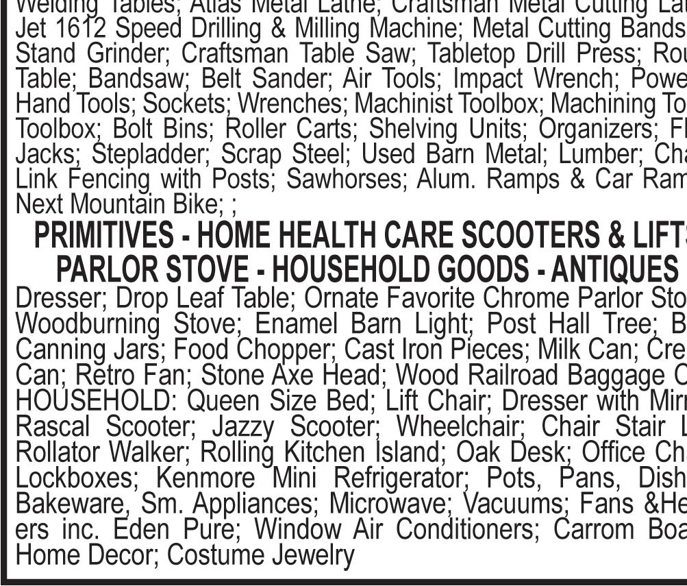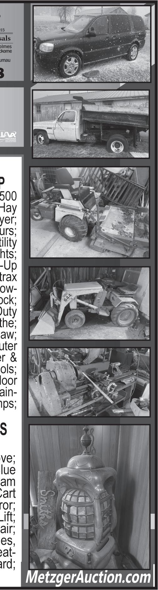 W. 800N, Roann. Chevy van, dump truck, Grasshopper mowers, Case tractor, machinist tools, Hay bine, scrap, primitives, home health care scooters, lifts, parlor stove, household goods, antiques. For more information go to metzgerauction.com.