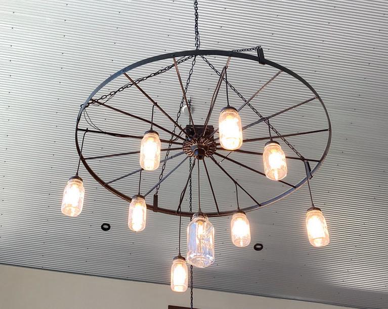 Wayne and Beth emphasized the personal materials, which were utilized in the home. Slate and wood were reclaimed from the farm Beth grew up on. A lighting fixture in the kitchen includes a wheel from farm equipment belonging to her grandfather.