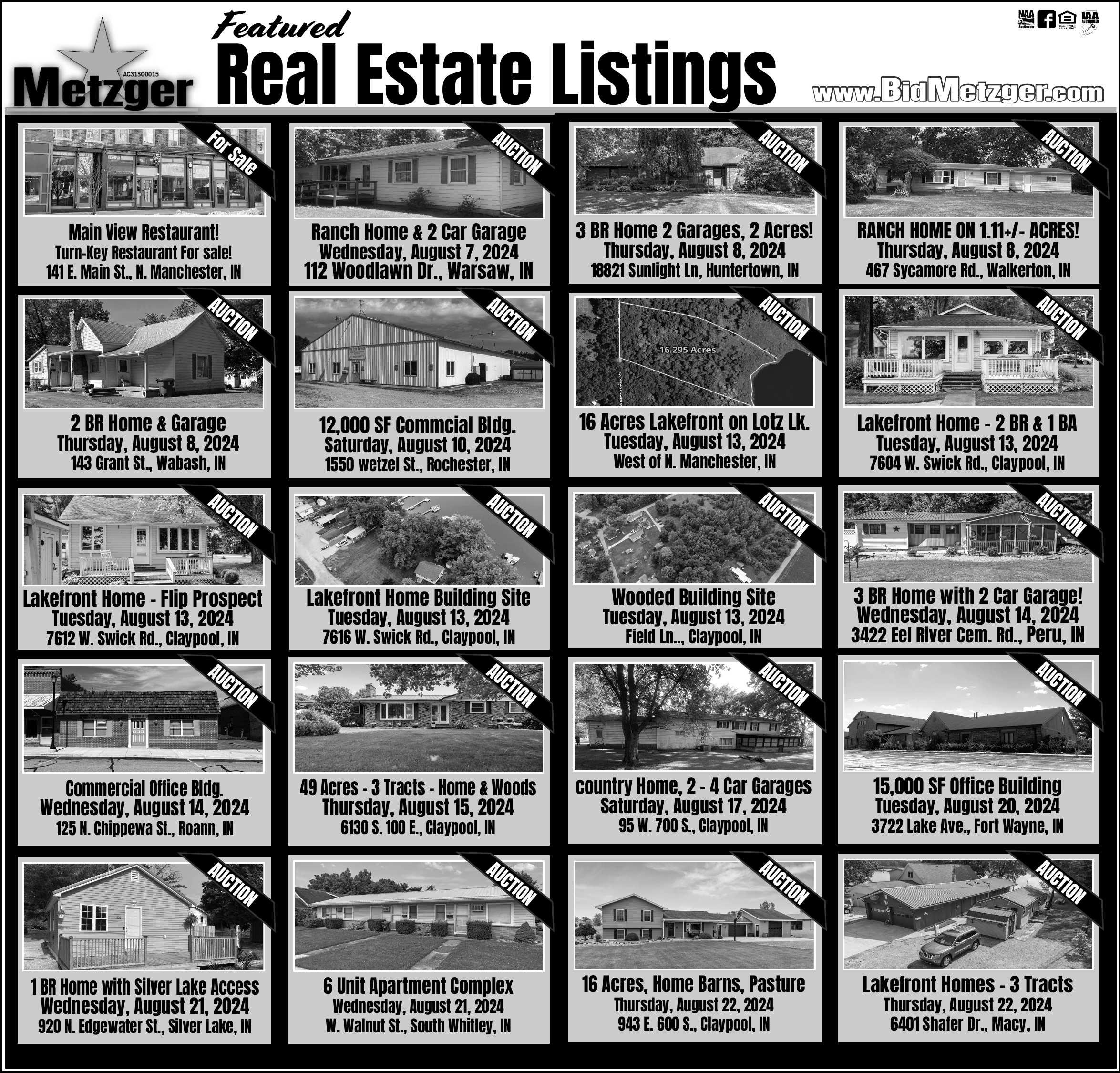 Bidding open until 6 p.m. Tuesday, Aug. 13. Located north of Disko, on west side of Lotz Lake on 800W, North Manchester. Recreational woods, 16.3 acres, with lake frontage. Bid online at metzgerauction.com. Metzger Property Services.