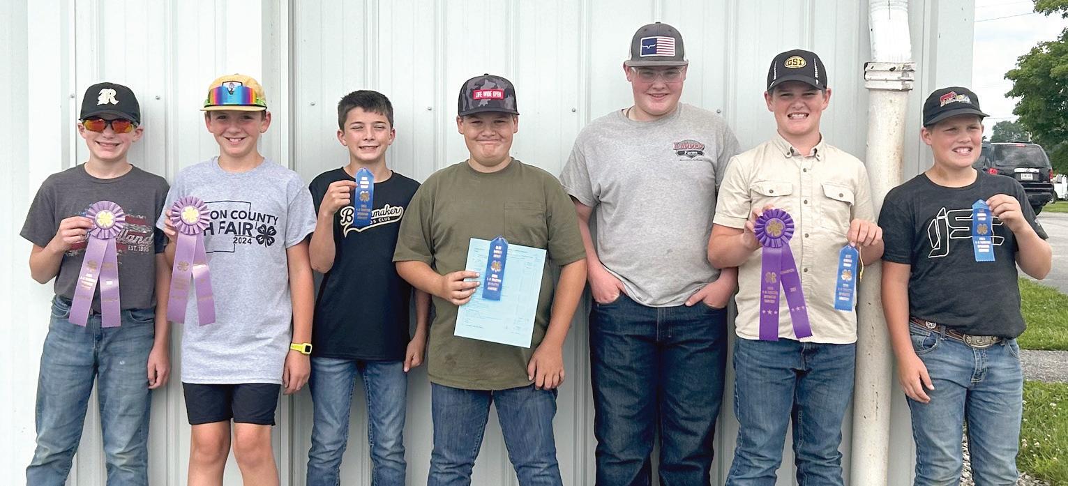 Burton, second place junior zero turn; Jacob Miller, second place junior lawn and garden; Andrew Douglass, third place junior zero turn; Harrison Burton, fifth place junior ag tractor; Terry Rock Luhnow, fourth place senior zero turn; Eli White, first place junior tractor; and Kade Jones, blue in junior zero turn. Photo provided by Jeannie Rock.