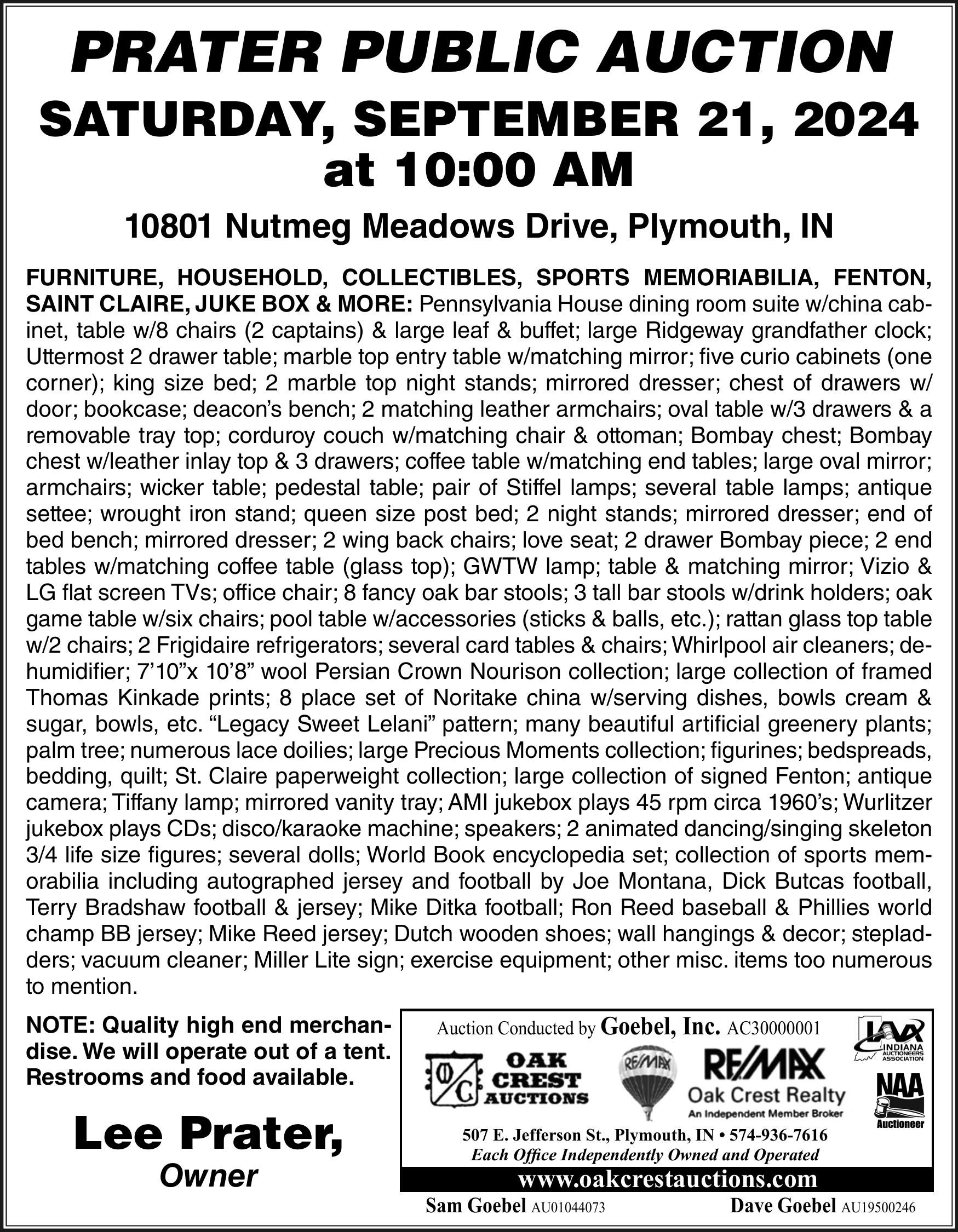 NO PETS ALLOWED ... UNLESS CERTIFIED SERVICE ANIMALS W/CERT. AS PROVIDED BY THE AMERICAN DISABILITY ACT TEDS AUCTION CENTER AC31400065 PHONE... 574-936-SALE (7253) COL. DARRELL PITTS AU10300102 TED ANNIS AU08900148 COL. PAUL BEAVER AU01036412 NEXT AUCTION