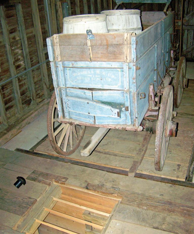 Farmers brought their wheat and corn by wagon onto a scale where it was weighed. The front end of the scale floor was manually lifted by ropes and pulleys so that the grain would fall out the back of the wagon into a holding bin in the basement. When empty, the scale floor was lowered and the wagon was weighed again to determine what the farmer would get for his crop.