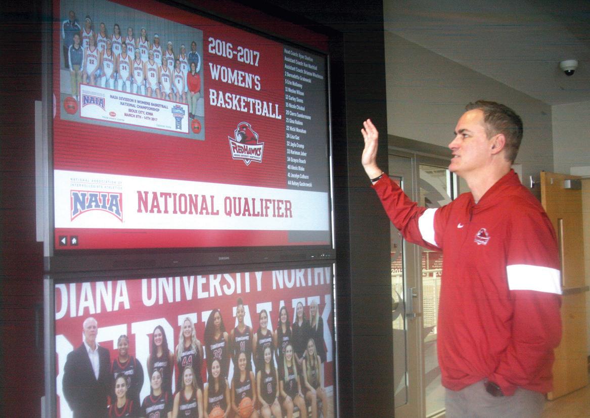 the IUN Hall of Champions garners glances from student athletes, Shelton said, “who look over their shoulders to see if their name or picture is on the screen. I’ve observed a lot of joy, a lot of pride. Lots of smiles.”