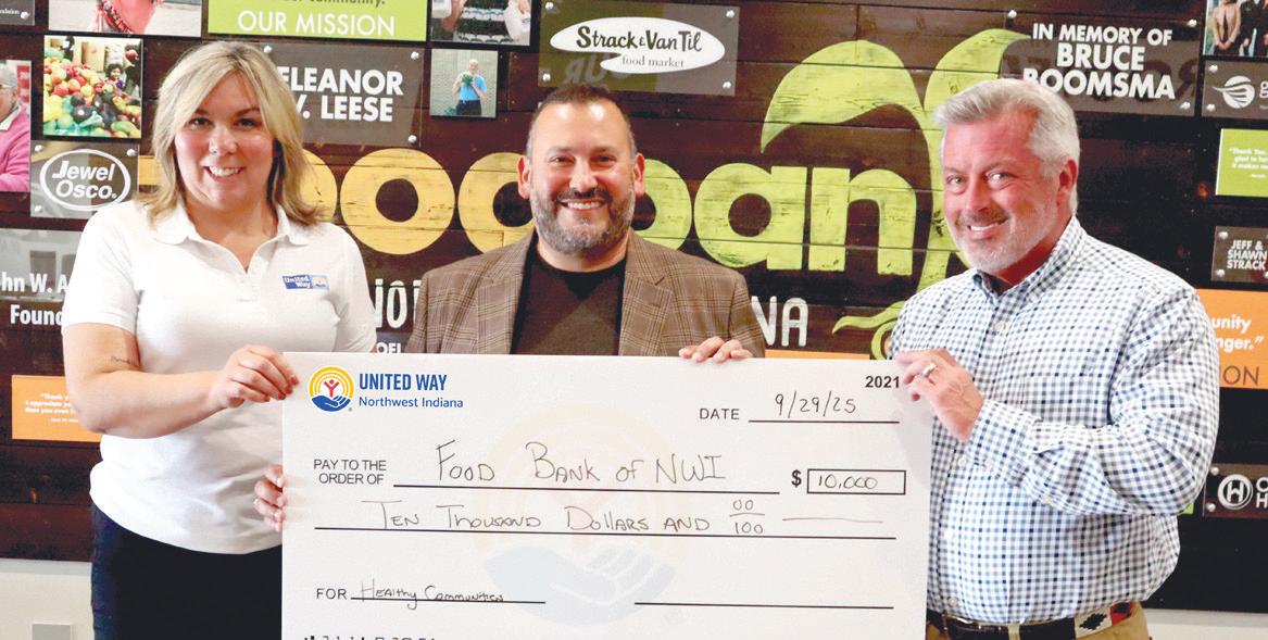 THE FOOD BANK United Way of Northwest Indiana recently presented the Food Bank of Northwest Indiana with a check for $10,000 to support the food bank’s vital work in fighting hunger and strengthening access to healthier food options across the region. Shown from left are Kristina Fry, vice president of development, United Way Northwest Indiana; Victor A. Garcia, president and CEO, Foodbank of Northwest Indiana; and Chris White, president and CEO, United Way Northwest Indiana. Photo provided by United Way of Northwest Indiana.