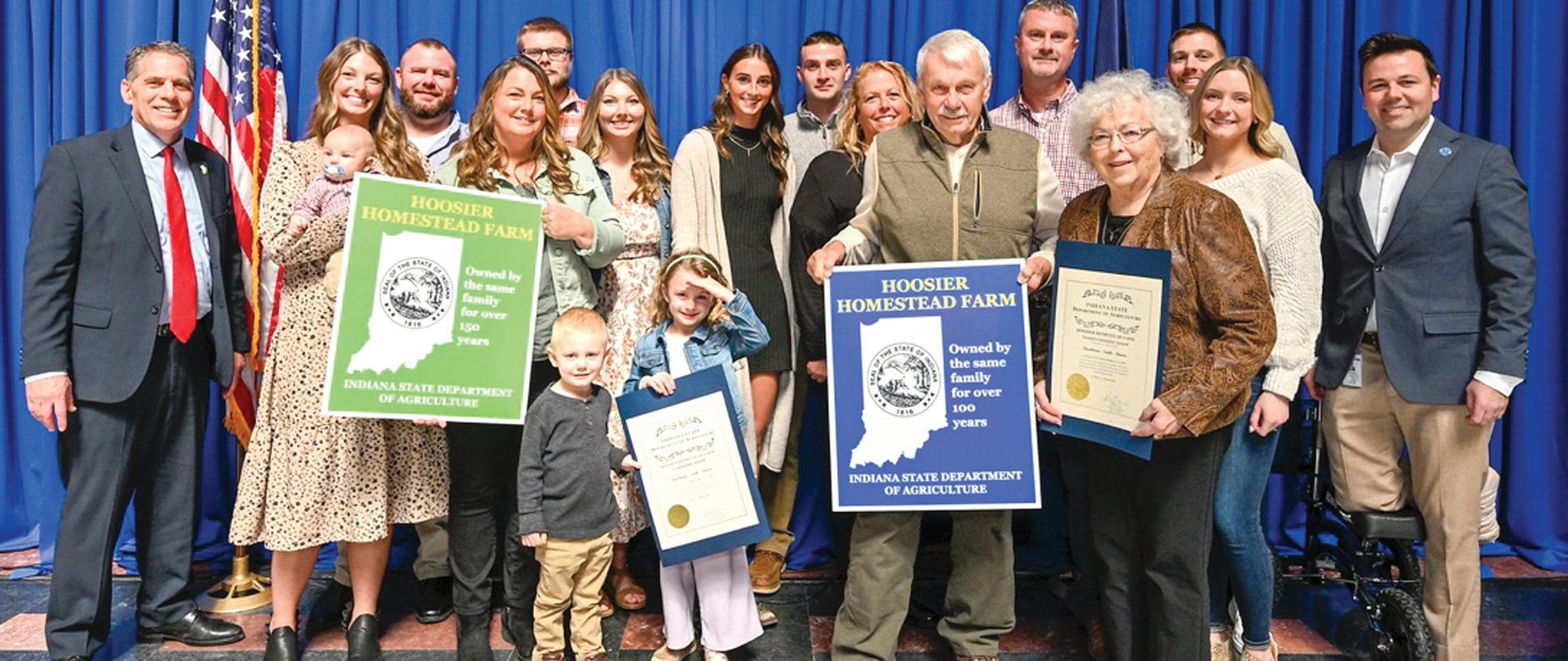 Shriver’s parents, Steve and Jane Shriver; widow Janie Shriver; sister Beth Smith; children Ben Shriver, Stephanie McCulley and Shayleigh Shriver; grandchildren and other family members accepted centennial and seisquicentennial awards from Indiana State Department of Agriculture Director Don Lamb and Indiana Lt. Gov. Micah Beck-