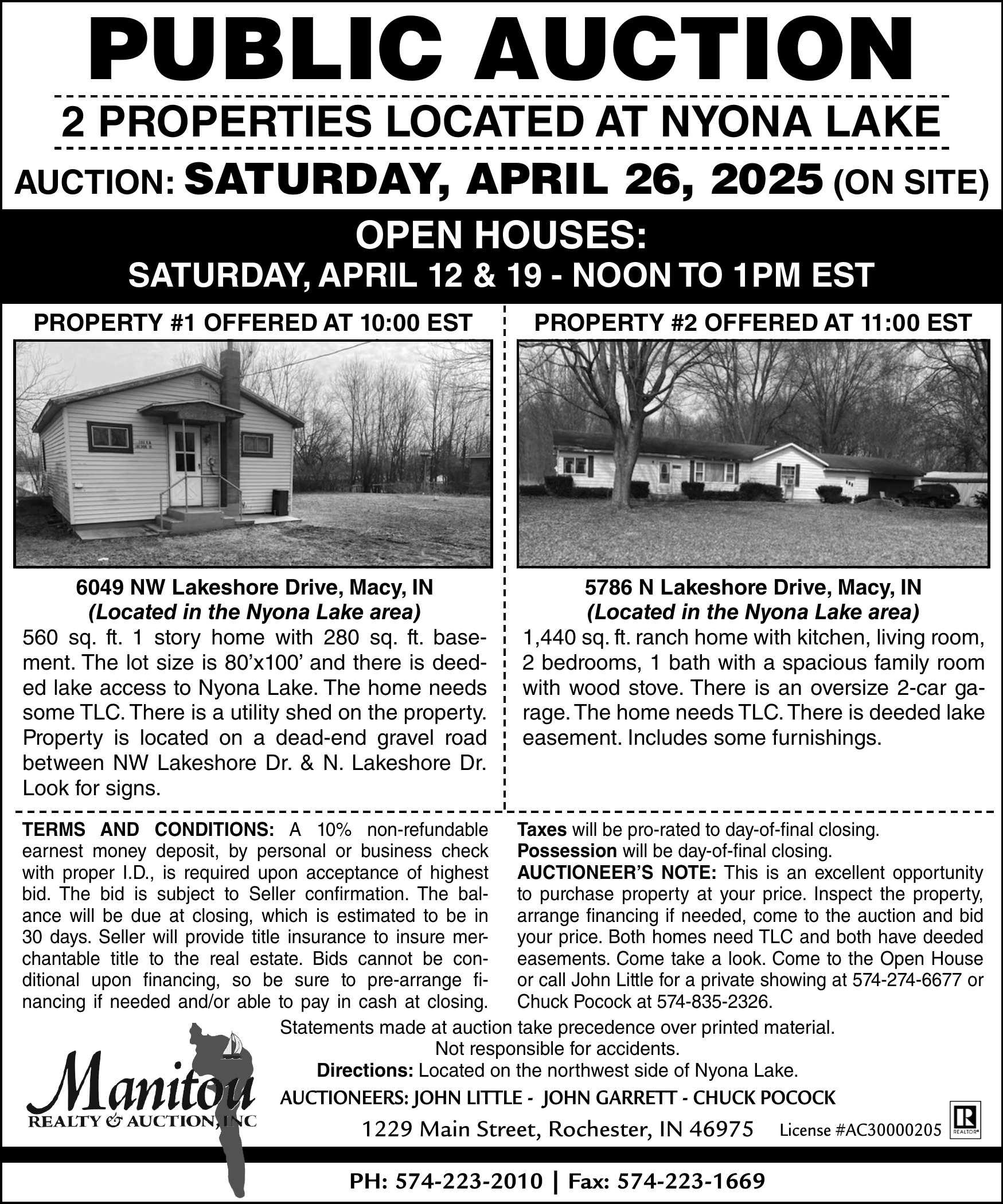 p.m. Tuesday, April 29. Property located at 206 N. Tucker St., Mentone. Two-story home, detached garage. Metzger Property Services, metzgerauction.com.