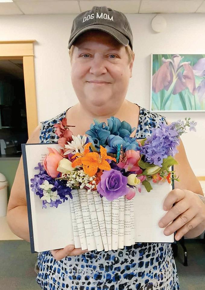 BOOK VASE — Cheryl Jessen is shown displaying her book vase she recently made at Akron Public Library. Patrons made book vases during the “Crafty Corner” group at the library. Photo provided by Akron Public Library.