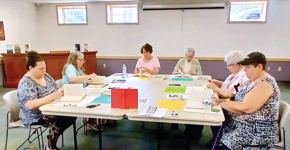 CRAFTY CORNER CREATIONS — “Crafty Corner” recently created book vases at Akron Public Library. Patrons shown making their creations are from left Elyse Shepler, Kathy Isbell, Ruth Schneider, Bonnie Dunbar, Margie Schubert and Cheryl Jessen. Photo provided by Akron Public Library.