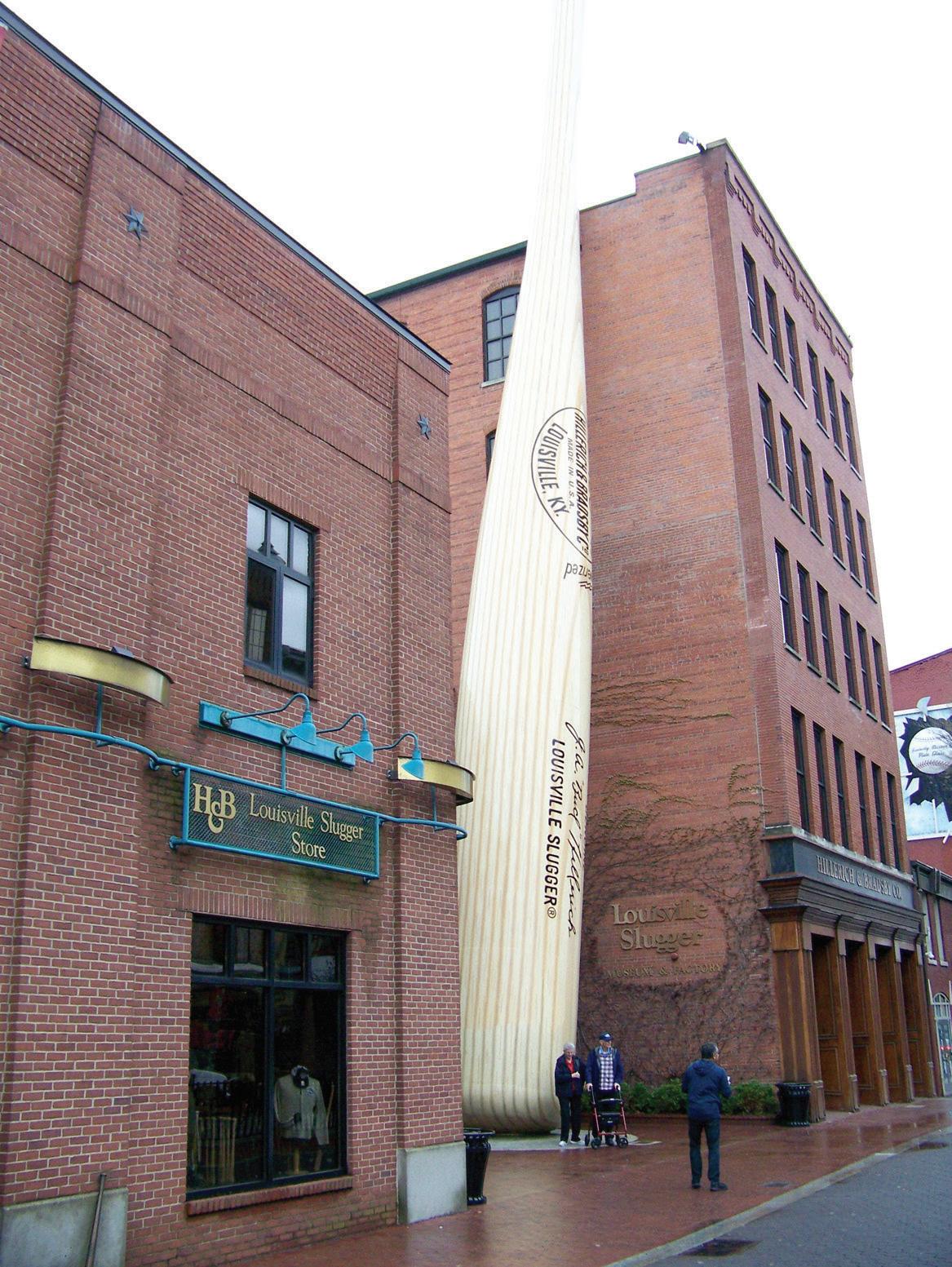 LOUISVILLE LANDMARK — A monster baseball bat in front of the Louisville Slugger factory and museum in downtown Louisville is 120-feet tall and weighs 68,000 pounds. A tour of the factory shows visitors how bats were made in the late 1800s and today.