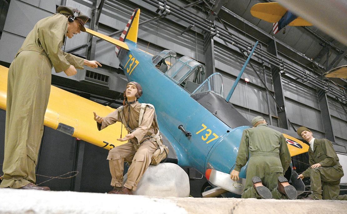 Along the way there are lifelike vignettes with uniformed mannequins attending to planes, loading ammunition, climbing into the cockpit and doing pre-flight inspections. One is of a young pilot getting chewed out royally for running his fighter plane into a fence, upending it and damaging the propellers.