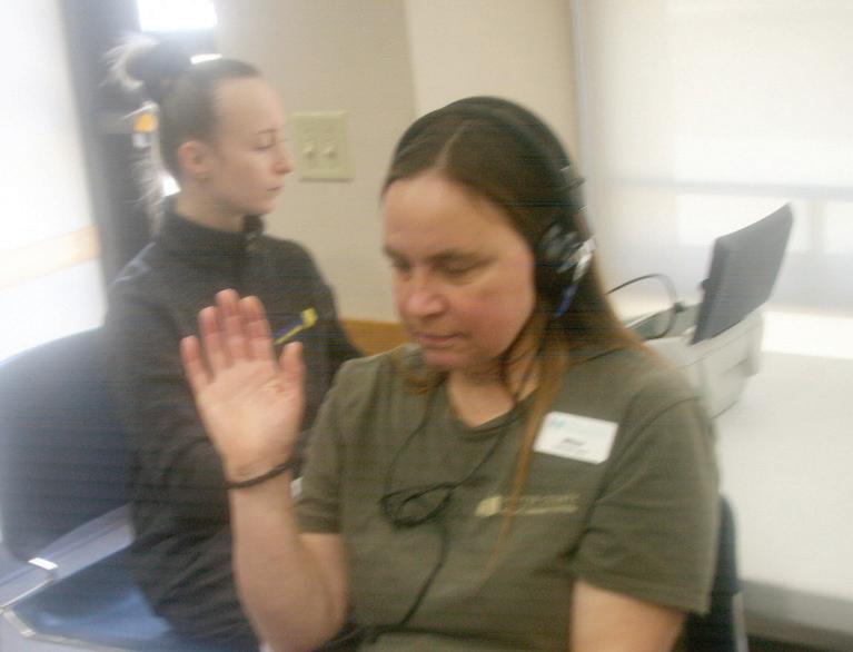 FREE HEALTH CHECK Willow Cataldo, community engagement coordinator for the Porter County Public Library System, has her hearing checked by Terra Cagle, outreach assistant and medical assistant with the Porter County Health Department, during an autumn workshop at the Portage branch library.