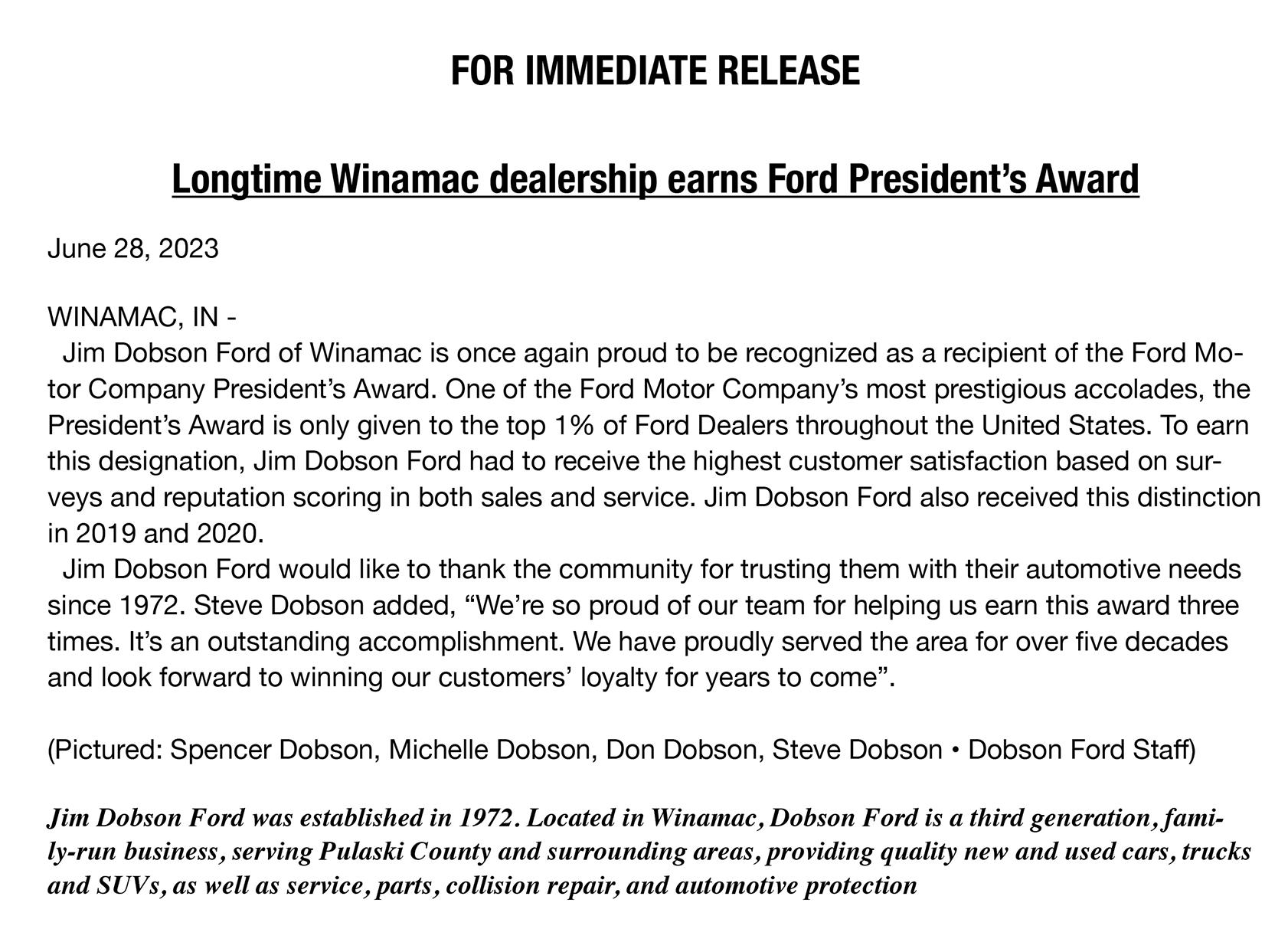 PAGE 8 THE MARKET WEDNESDAY, JULY 5, 2023 “See Darwin Knebel, Tiffany Freeman or Justin Hunt for YOUR next vehicle!” NO TITLE OR DOC FEES 1109 S. MONTICELLO STREET WINAMAC, IN 46996 SALES HOURS: MON-FRI 8AM-6PM SAT. 8AM-2PM SERVICE HOURS: MON-FRI 8AM-5PM SAT. 8AM-NOON WWW.WINAMACCDJR.COM 574.946.7501 NO TITLE OR DOC FEES “SEE STEVE, SPENCER, DON OR SEAN FOR YOUR NEXT VEHICLE!” Focused on providing exceptional service in a timely manner. 574-946-3117 • 1-800-388-0112 Next To Winamac Plaza • www.jimdobsonford.com NEW! 2023 FORD MUSTANG GT $53,250 10 SPEED AUTOMATIC, 5.0L V8, 15/24 MPG CITY/HWY 1.5L ECOBOOST ENGINE, 8 SPEED AUTO. TRANS., 26/32 MPG CITY/HWY 2023 FORD ESCAPE $35,370 1.5L ECOBOOST ENGINE, 8 SPEED AUTO. TRANS., 26/32 MPG CITY 0% FOR 36 MONTHS! 2023 FORD ESCAPE $35,370 #3023 ‘21 FORD F-150 PICKUP JUST IN! 5.0L, SOLD & SERVICED HERE, SUNROOF, 38K MILES $45,994 #3027A ‘21 FORD F-350 LARIAT SOLD & SERVICED HERE! LARIAT ULTIMATE, 27K MILES $74,109 #3011A ‘20 FORD EXPLORER XLT SOLD & SERVICED HERE, NEW TIRES! TURBO, PANORAMIC ROOF, 53K MILES $32,558 #3016A ‘19 FORD F-150 SOLD & SERVICED HERE, 5.0L PLATINUM SERIES, 62K MILES $43,995 #2977A ‘20 FORD F-150 XLT SPECIAL EDITION PKG, SOLD & SERVICED HERE, 47K MILES $37,999 #3000A ‘17 CHEVY SILVERADO 1500 LTZ, LOCAL TRADE! 5.3L V8, NAVIGATION, 102K MILES $31,088 #2998B ‘14 JEEP GRAND CHEROKEE JUST IN! TRAILER TOW, HEATED LEATHER, 4WD, 148K MILES $14,992 #2964B ‘12 FORD FLEX SE LOCAL TRADE, 1 OWNER! 3.5L V6, 106K MILES $12,105 #3008A ‘13 FORD ESCAPE SEL JUST IN! 4WD, HEATED LEATHER, LOCAL TRADE, 125K MILES $10,879 #3013A #3018 ‘22 CHEVY SILVERADO L 1500 LOCAL TRADE, LTZ 10K MILES $56,381 #3020A 1 Owner, Leather Interior, 4x4, Loaded!, 24K miles WCDJR $32,746 #C8055A 2021 JEEP CHEROKEE LIMITED Loaded! 4x4, DieselGreat Fuel Economy! 98K miles WCDJR $18,885 #C8035A 2014 JEEP GRAND CHEROKEE OVERLAND 4x4, Local Trade, 9 Speed Auto, Loaded! 56K miles WCDJR $24,929 #C8034A 2018 JEEP CHEROKEE OVERLAND 3.6 V6, 4x4, Seats 5, 35K miles WCDJR $41,596 #5524A 2021 JEEP WRANGLER UNLIMITED SAHARA Truck Crew Cab, 3.6L V6, 4x4, 46K miles WCDJR $41,982 #5422A 2021 JEEP GLADIATOR OVERLAND 4x4, Local Trade, One Owner, 42K miles WCDJR $37,953 #C6271A 2018 JEEP WRANGLER UNLIMITED SAHARA 0% FOR 36 MONTHS!