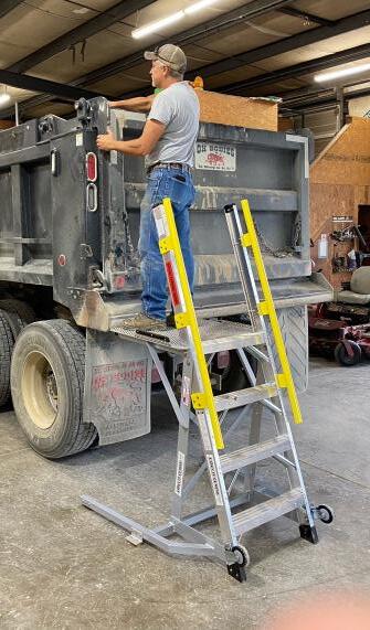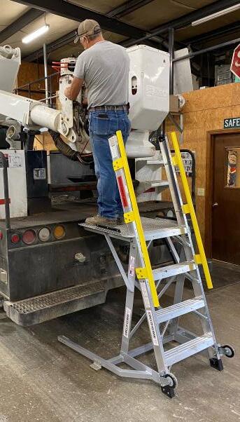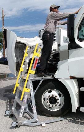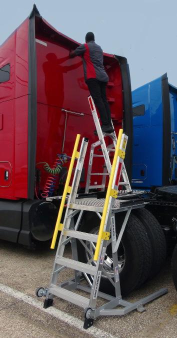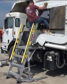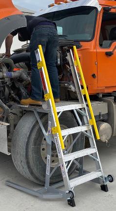 The LockNClimb 44LNCTRKENG platform ladder is used to access many hard to reach maintenance and repair points on work trucks with 24.5 tires, such as solid waste trucks, dump trucks, utility trucks, redi-mix and others. Allows stable close working access to engines, windshields, side chute doors, booms and more.