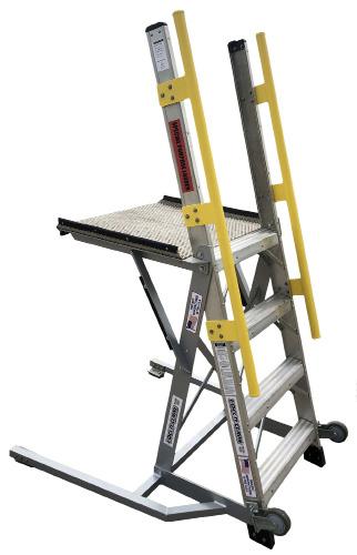 OSHA rated 375-lb. Special Purpose Ladders. • Industrial 6061-grade aluminum support base, frame and plate. • Commercial grade hard rubber wheels. • Yellow safety handrails. • Brass feet to allow easier sliding. • Stickers indicate OSHA/ANSI compliance. • Made one at a time by skilled craftsmen in the USA.