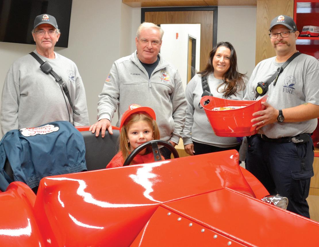 VISITING THE NEW STATION Walker June Grover, seated, stopped by to drop off some goodies for the firefighters and EMTs last week and to see Nappanee’s new fire station. This replica of the original Smokey Stover vehicle sits in the entry of the station. Also shown from left are Monte Flowers, paramedic; Don Lehman, fire chief; Ali Norton, firefighter/paramedic; and Nick Graff, firefighter and EMT.