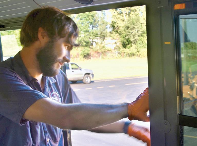 AN EASY OUT Jacob Ridgeway, of the Warsaw Schools transportation department, demonstrates an emergency exit allowing students to escape a bus in case of accidents, fire or an intruder. Protocols and bus layouts are designed for full evacuations to take no more than two minutes. “This isn’t UPS,” Jacob said regarding the importance of safety procedures. “If a package is damaged, you can buy a new one, but you can’t replace a child. Our kids are everything.”