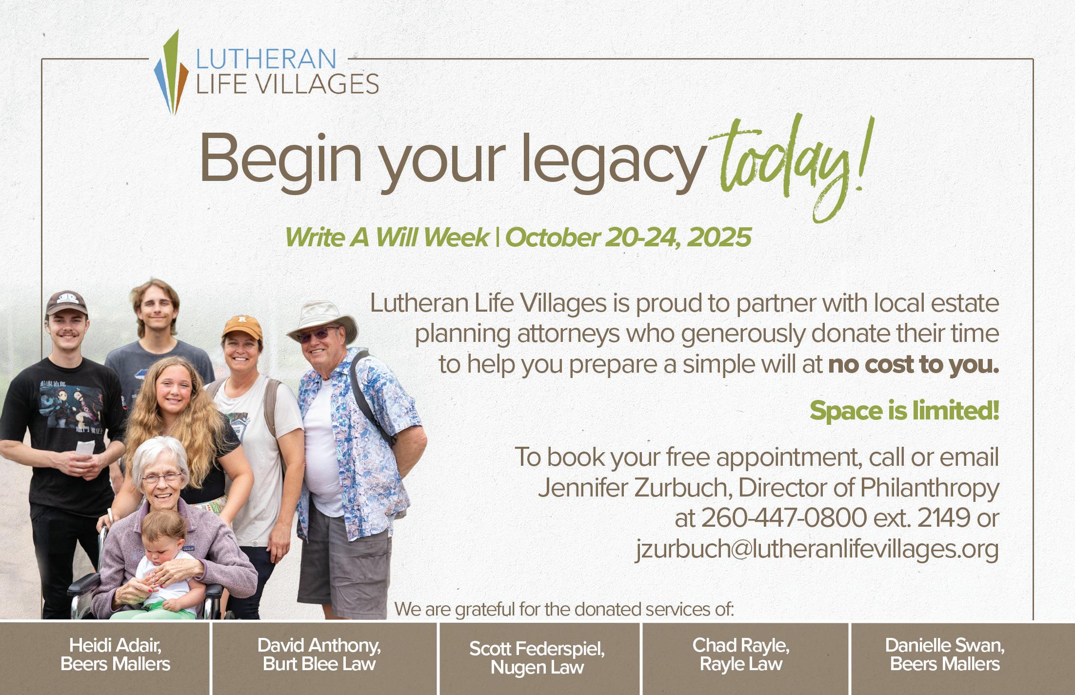 These stories highlight the diverse reasons and ages for which a will is a powerful tool. To assist our community members, Lutheran Life Villages has partnered with five local estate-planning attorneys who are generously donating their time to help you create or update a simple will during Write a Will Week. See details in our advertisement on page 16.